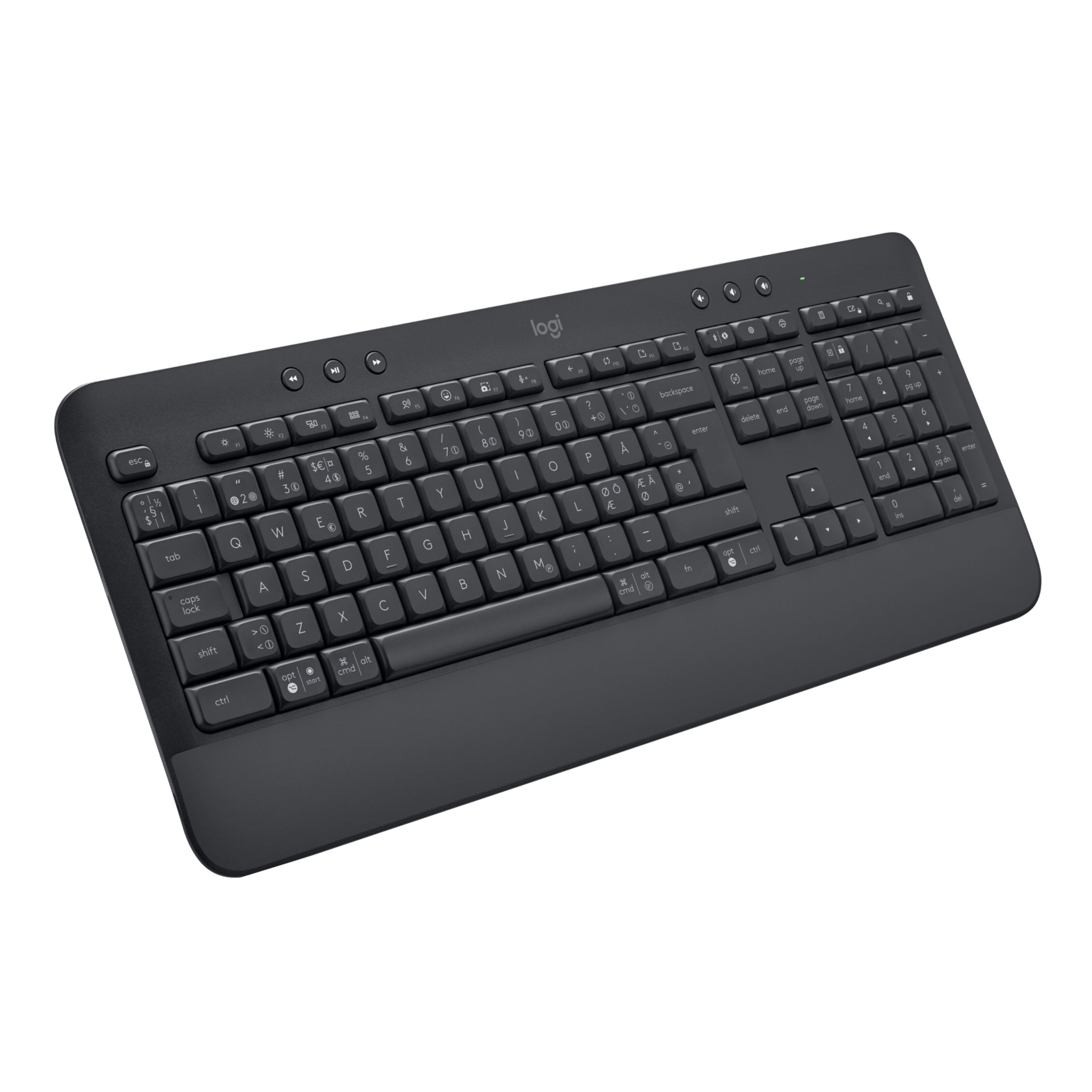 Logitech Signature K650 är ett trådlöst tangentbord designat för komfort och effektivitet. Med integrerat handledsstöd och anpassningsbara genvägar underlättar det långa arbetspass. Tangentbordet är spillsäkert, enkelt att rengöra och har en batteritid på upp till 36 månader.