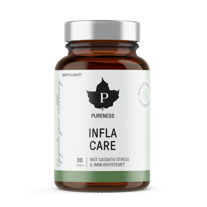 Pureness Infla Care är ett kosttillskott som innehåller resveratrol, grönt te extrakt och druvkärneextrakt. Det innehåller även vitamin C, som bidrar till att skydda cellerna mot oxidativ stress och stödjer immunsystemets normala funktion.