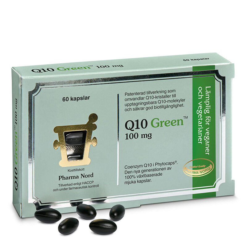 Q10 Green från Pharma Nord är ett kosttillskott som innehåller 100 mg coenzym Q10 i vegetabiliska kapslar. Produkten är speciellt framtagen för de som föredrar animaliefria alternativ. Kapslarna är gjorda av potatis, ärtor och majs.