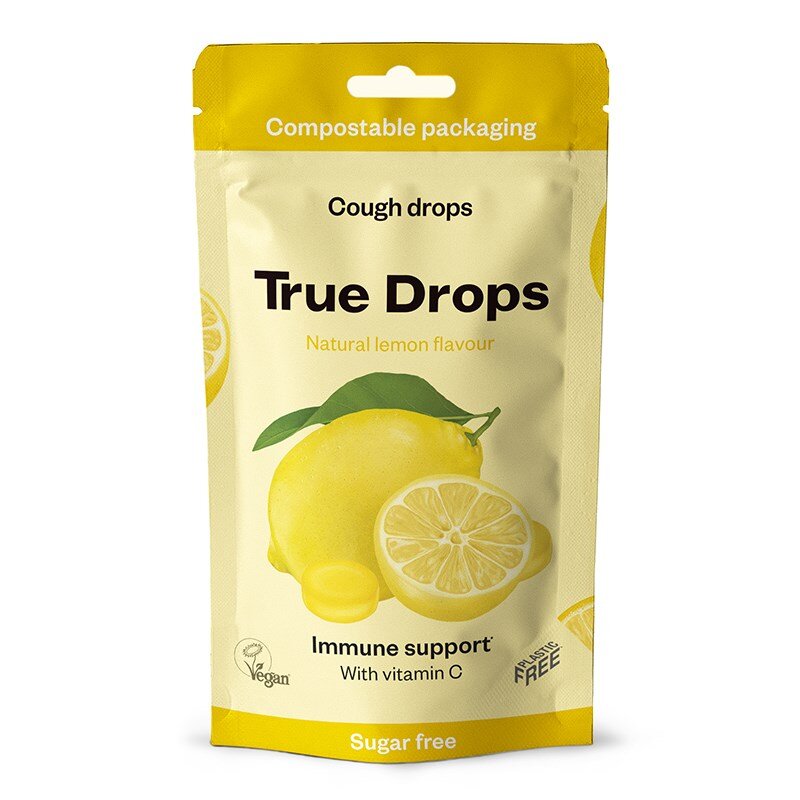 True Drops Natural Lemon är halstabletter med en frisk och syrlig smak av citron. De innehåller inga konstgjorda tillsatser eller socker, utan är sötade med stevia och xylitol. Tabletterna är även biologiskt nedbrytbara och kommer i en plastfri förpackning.