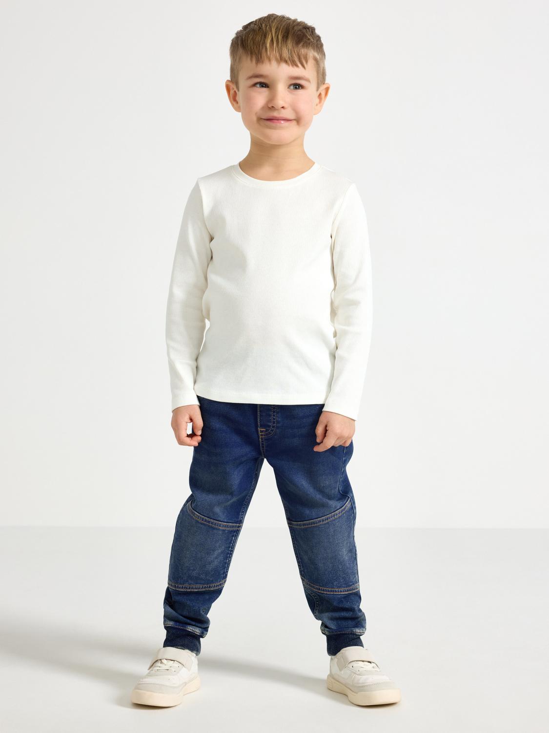 Dessa pull-up-jeans är gjorda i mjuk denimtrikå och har en bekväm passform med vida ben som smalnar av. De har en elastisk midja och ribbade muddar för enkel användning. Förstärkta knän ger extra hållbarhet.