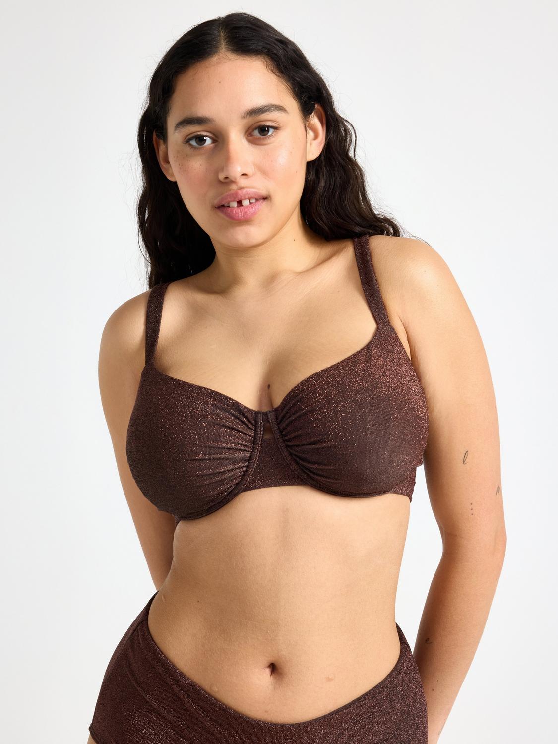 Denna ovadderade bikiniöverdel är designad för att ge extra stöd och komfort, speciellt för dig med större byst. Det glittriga lurex-materialet ger en extra touch av elegans och stil till din strandlook.