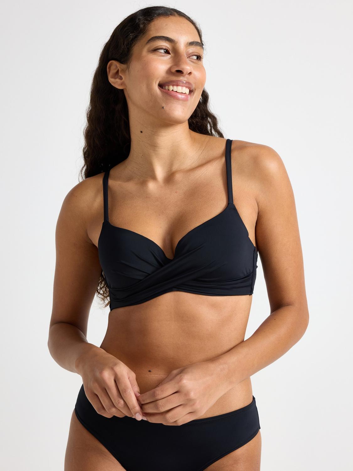 • Bikini-bh i återvunnen polyester. • Modell med vriden drapering framtill. • Mjuk, bygellös bikini-bh med stödskenor i sidorna. • Kupa med uttagbar vaddering. • Reglerbart axelband. • Lättstängt metallspänne bak. • Metalldetaljerna är nickelfria. • Underdelen säljs separat så att du kan mixa och matcha för att hitta den perfekta nederdelen för just dig och dina kurvor. Denna produkt består av polyester tillverkad av återvunnen råvara från till exempel förbrukade PET-flaskor. Framställningen av återvunnen polyester kräver mindre mängd energi och kemikalier än konventionell polyester.