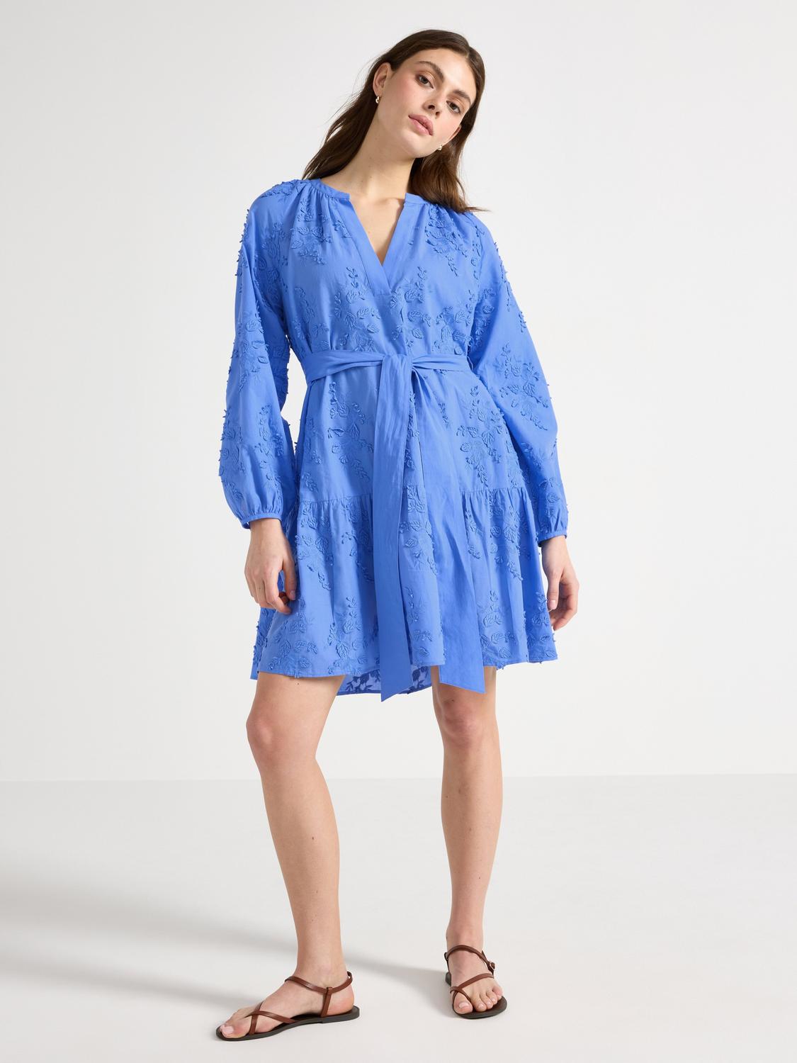 Miniklänning med broderier och knytband i midjan.