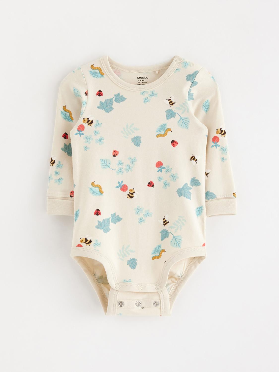 En söt och bekväm body för bebisar, tillverkad i mjuk bomullsväv. Bodyn har en avslappnad passform med volangdetaljer vid halsen och elastiska öppningar för armar och ben. Praktiska tryckknappar baktill och i grenen underlättar vid blöjbyten.