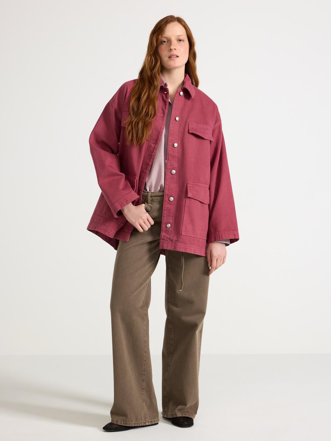 En oversized cargojacka i slitstark bomullstwill. Jackan har en avslappnad passform och är utrustad med stora fickor för förvaring. Den stängs med knappar och passar perfekt som ett lager-på-lager plagg.