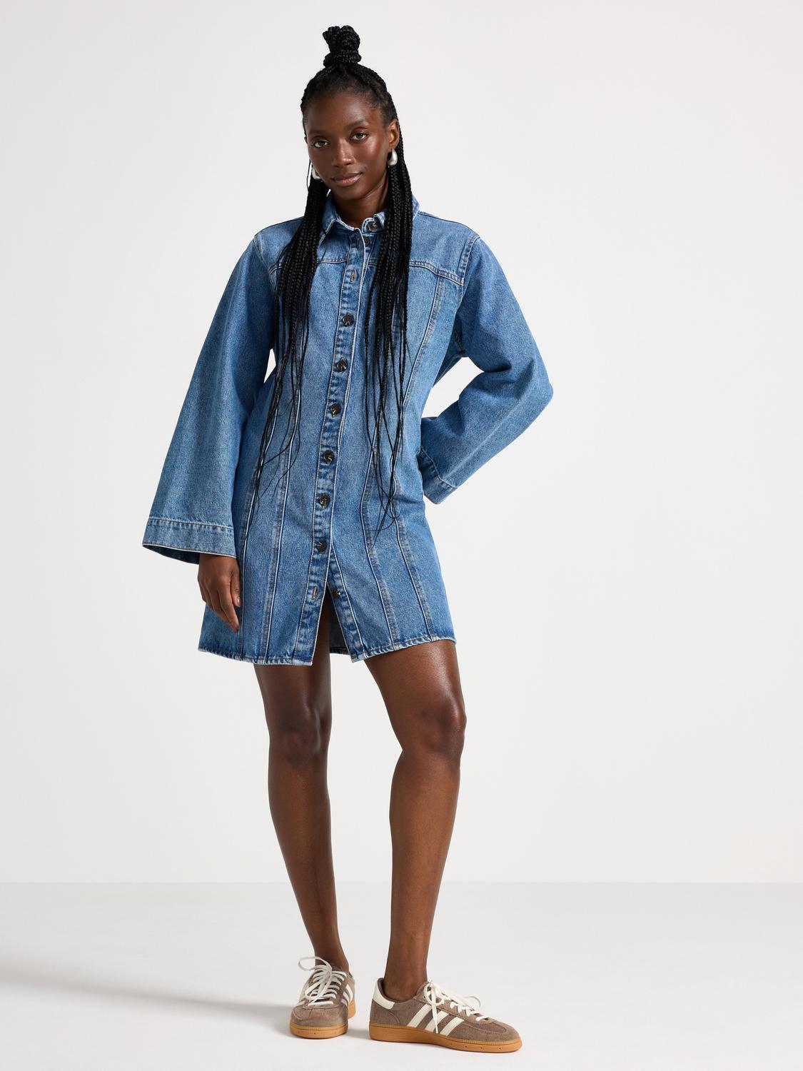Långärmad miniklänning i denim med krage och knappstängning framtill.
