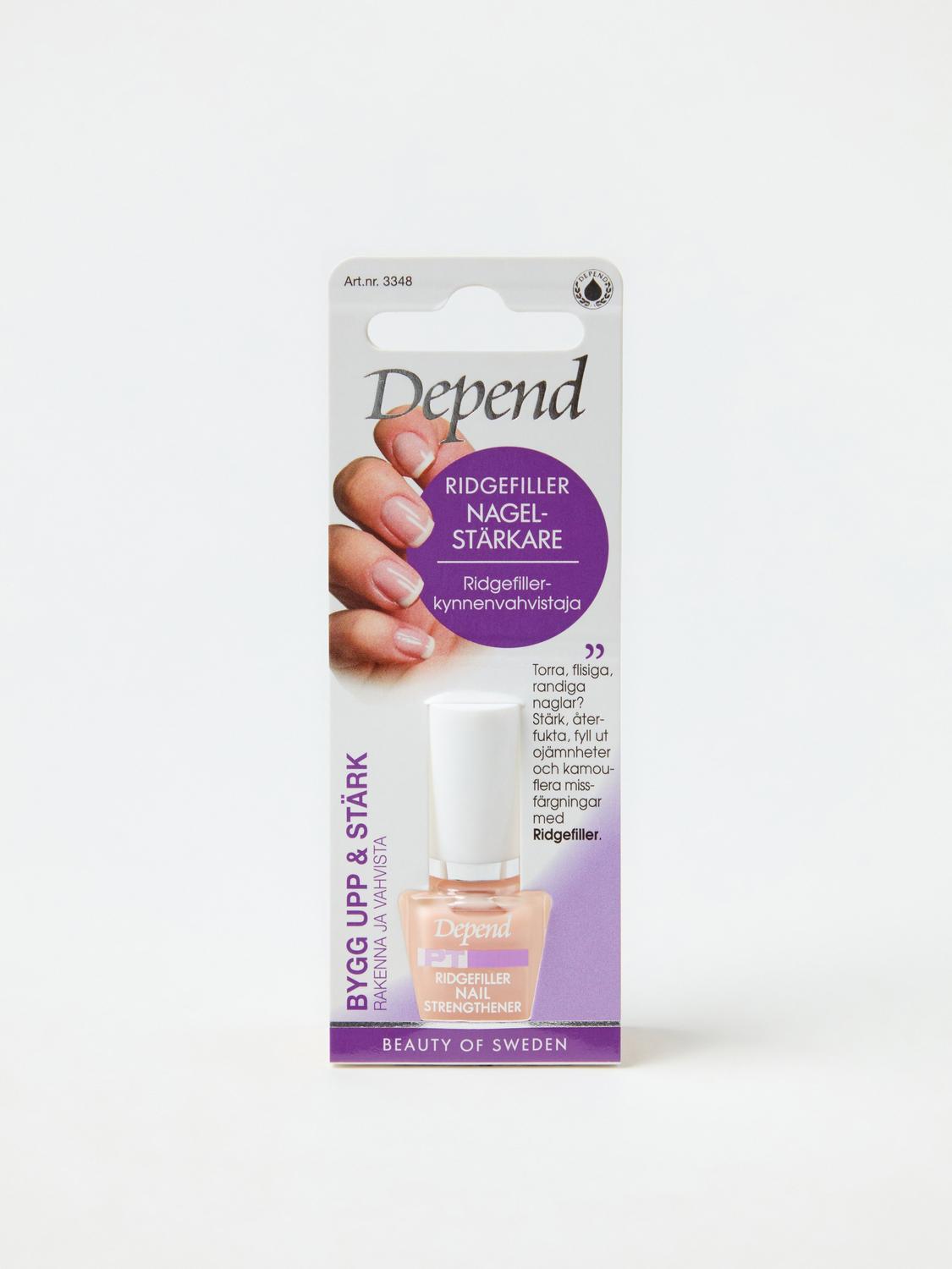 Denna nagelolja från Depend ger daglig vård till dina naglar, oavsett om de är torra, flisiga, mjuka eller sköra. Oljan är berikad med myrra, avokado- och olivolja samt E-vitamin för att stärka och återfukta naglarna.
