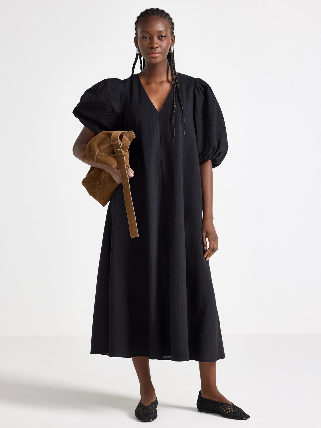 Midiklänning i bäckebölja med puffärmar.