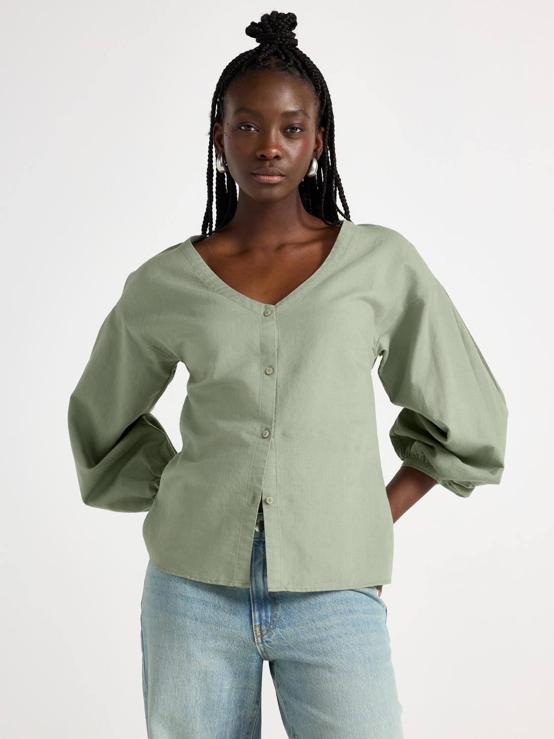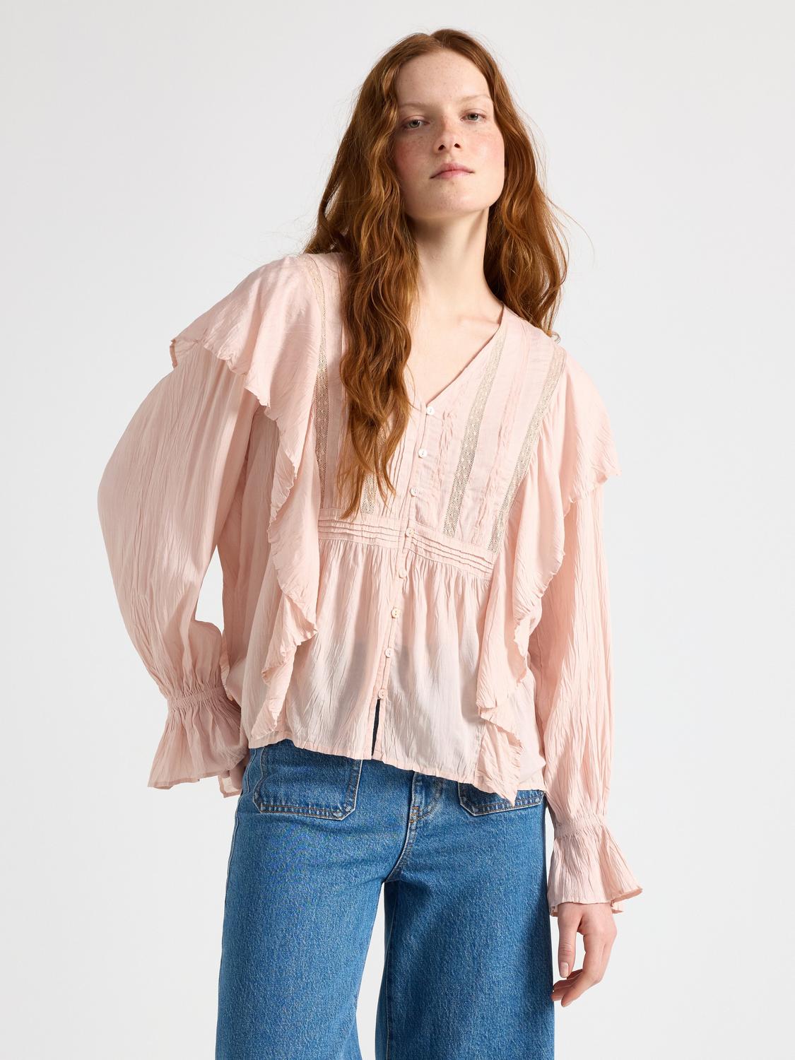 Denna blus är tillverkad i vävd bomull och har en kort ärm samt ett knytband framtill. Den har en ledig passform och är perfekt för både vardag och fest.