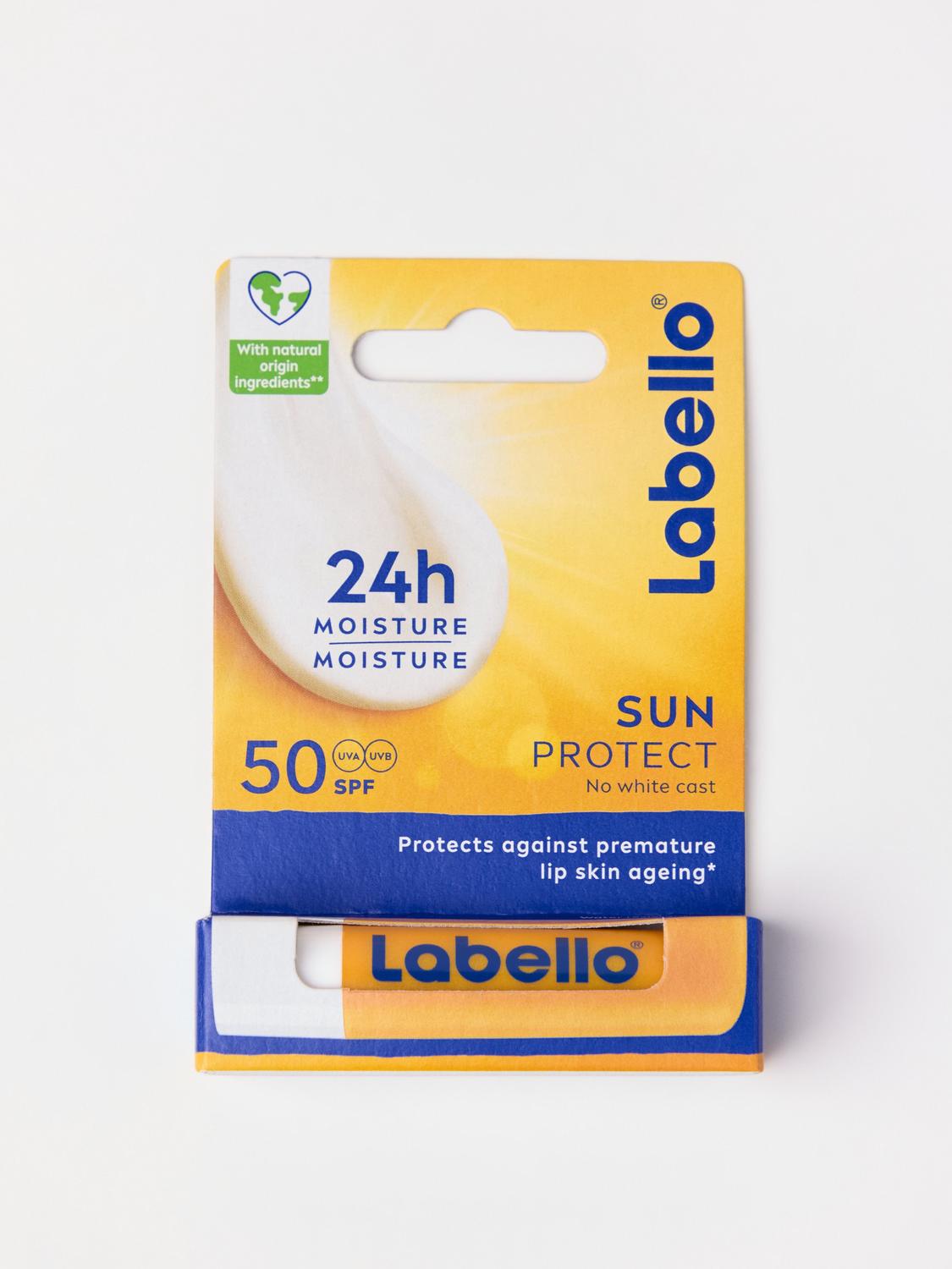 Labello Sun Protect Lip Balm är ett vårdande läppbalsam med SPF 30 som skyddar dina läppar mot UVA/UVB-strålar och solens skadliga effekter. Den nya förbättrade formulan med naturliga oljor och etiskt framställt Sheasmör ger detta cerat en behaglig konsistens som omedelbart smälter på läpparna och håller dem återfuktade i 24 timmar (kliniskt testat). Njut av glada stunder ute i solen med mjuka och skyddade läppar! Se till att applicera detta läppsyl med SPF ofta, särskilt efter att ha ätit, simmat eller handdukstorkning. Denna LABELLO läppvård är dermatologiskt testad. 5,5 ml. Viktiga bruksanvisningar: Applicera generöst före solexponering och återapplicera ofta, särskilt efter simning/handdukstorkning/när du har ätit för att bibehålla det ursprungliga skyddet. Undvik solen mitt på dagen och långvarig solexponering. Håll spädbarn och små barn borta från direkt solljus Stanna inte för länge i solen, även om du använder en solskyddsprodukt. Överexponering av solen utgör ett allvarligt hot.