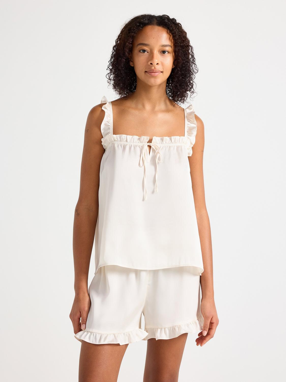 Pyjamaslinne i mjuk satin med volangdetaljer, elastisk kant upptill och knytband framtill.