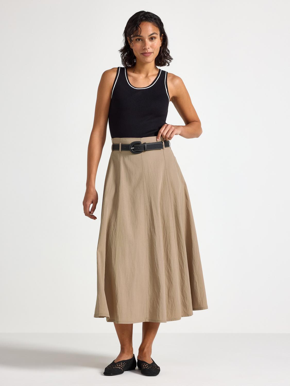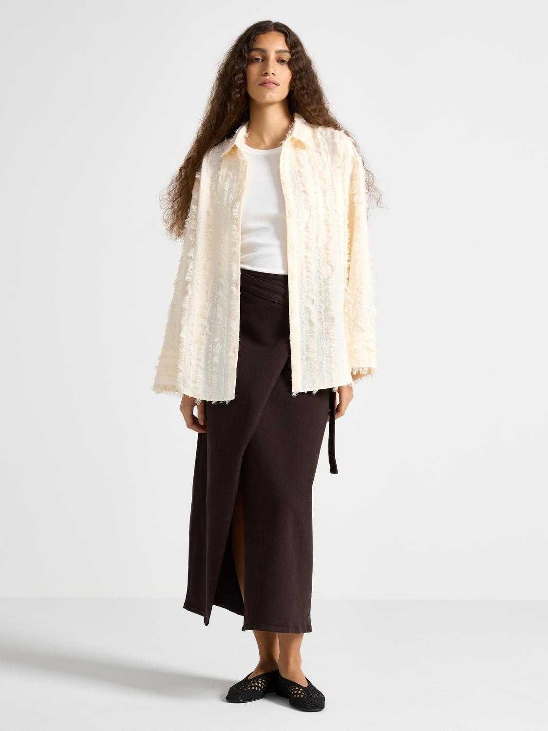 En maxikjol i kraftig bomullsdenim med en utsvängd silhuett. Kjolen är designad för att vara både bekväm och stilfull, perfekt för en avslappnad men trendig look.