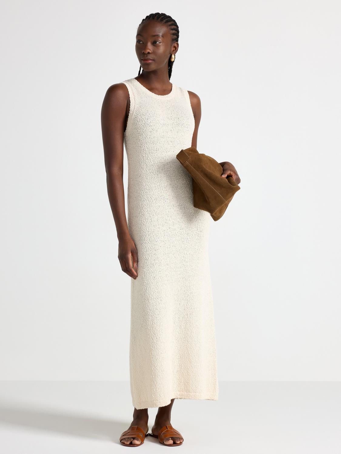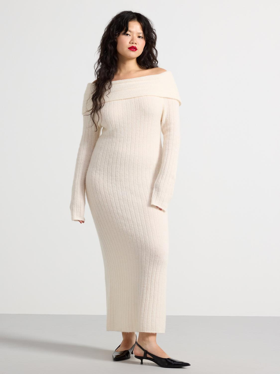 Denna mönsterstickade maxiklänning har en virkad look och en figurnära passform. Klänningen är perfekt för både vardag och fest, och ger en feminin och trendig stil.