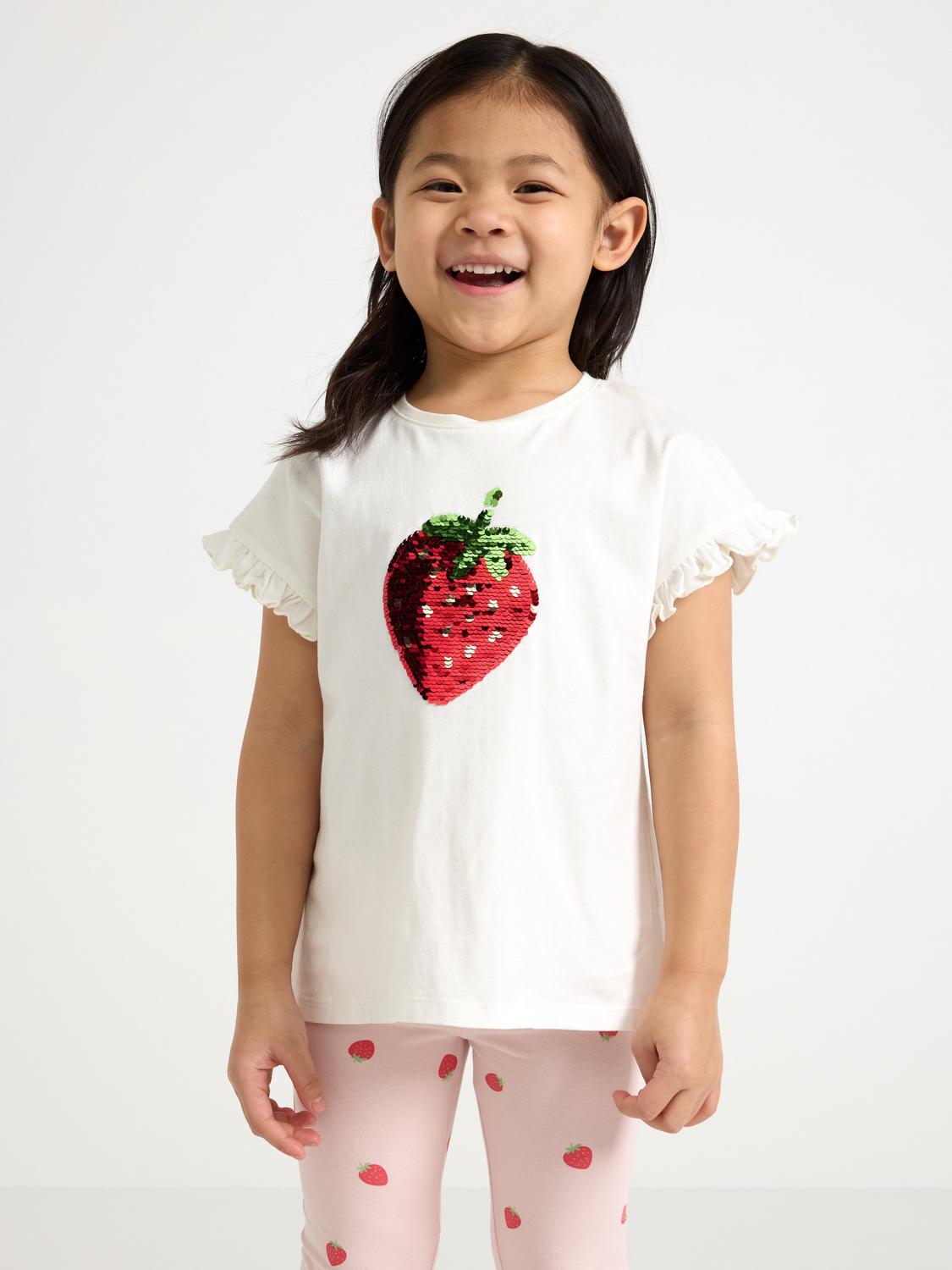 Topp i mjuk bomull med paljetter på framsidan och korta ärmar med volangkant.