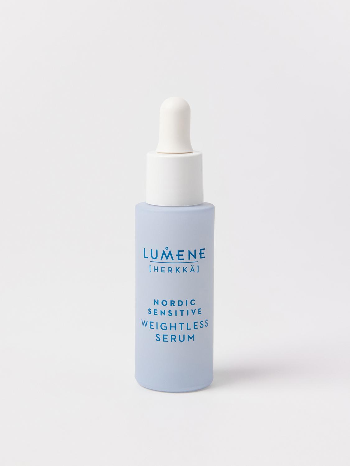 Lumene Nordic Sensitive Weightless Serum är ett lätt serum med en gelkonsistens som passar alla typer av känslig hud. Det innehåller nordiska havreceramider som hjälper till att stärka hudens fuktbarriär och återfuktande blåbärsvatten som snabbt absorberas av huden. Serumet reducerar rodnad och torrhet och ger huden en behaglig känsla.
