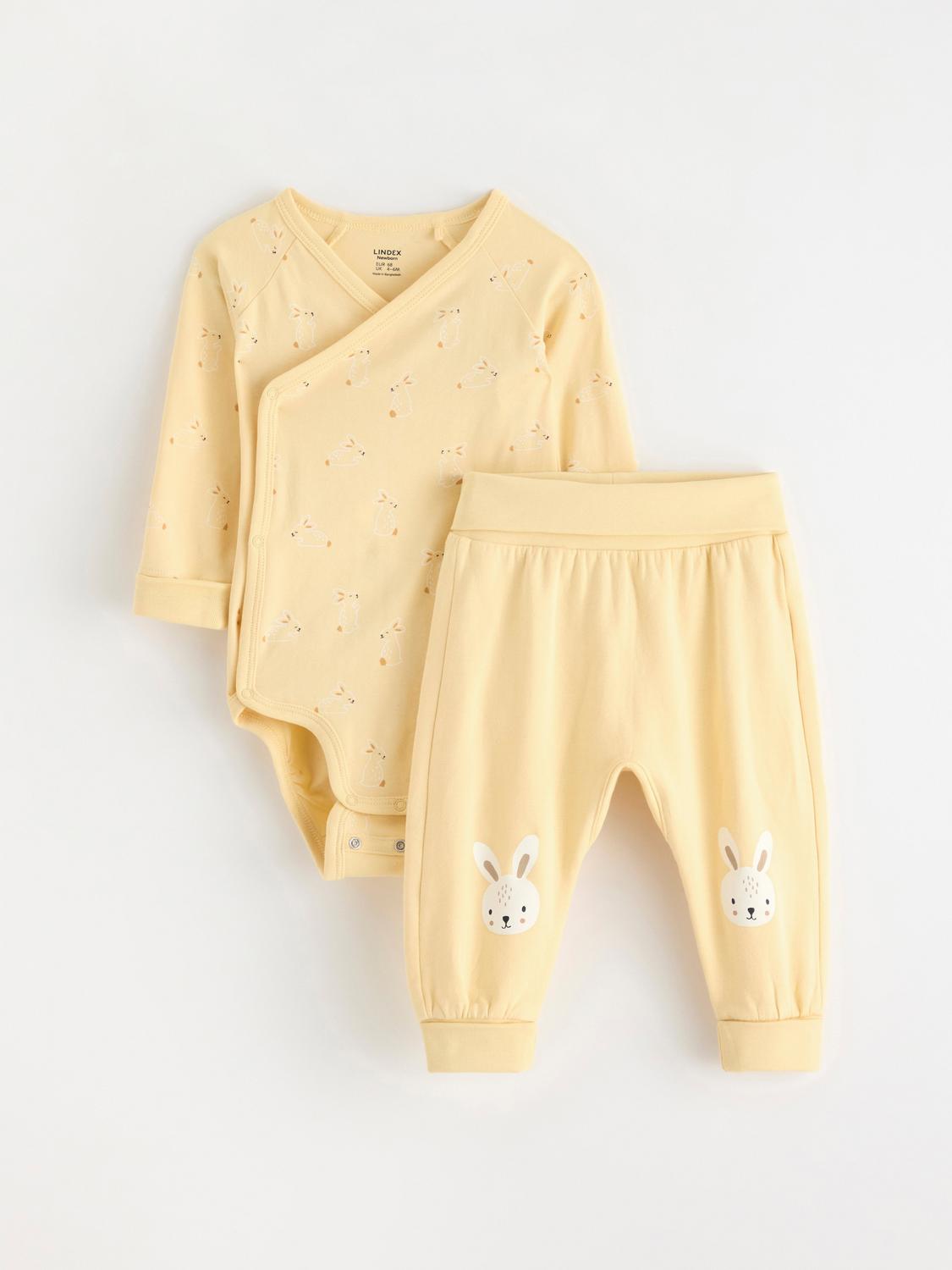 Ett gulligt set för bebisar, bestående av en omlottbody och ett par mjuka byxor. Båda delarna är tillverkade i skön bomull och har fina mönster. Bodyn är designad för att vara enkel att ta på och av, och byxorna har ett sött tryck på knäna.