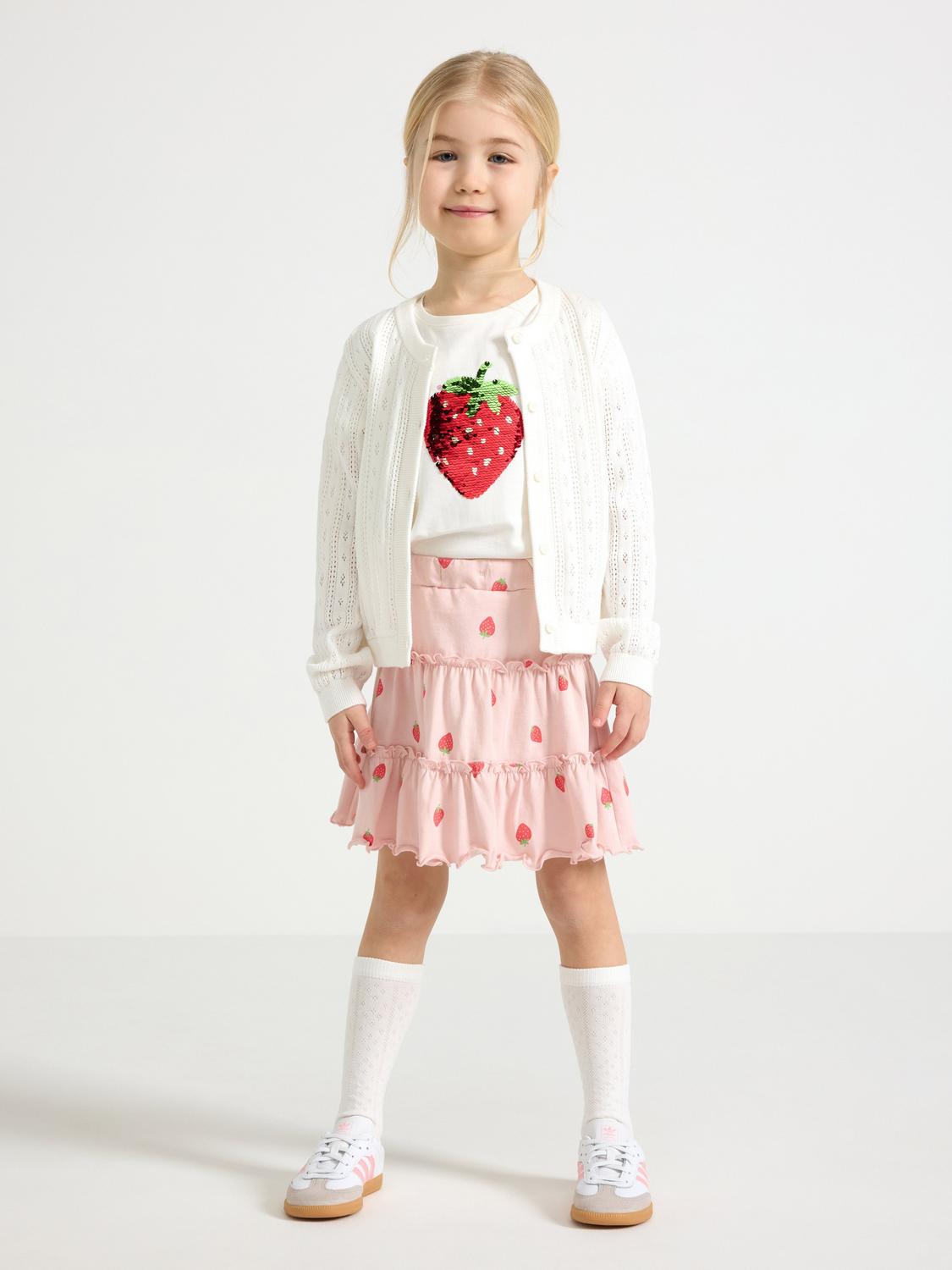 En bekväm kjol i mjuk bomullstrikå, perfekt för lek och bus. Kjolen har en elastisk midja som kan justeras för bästa passform.