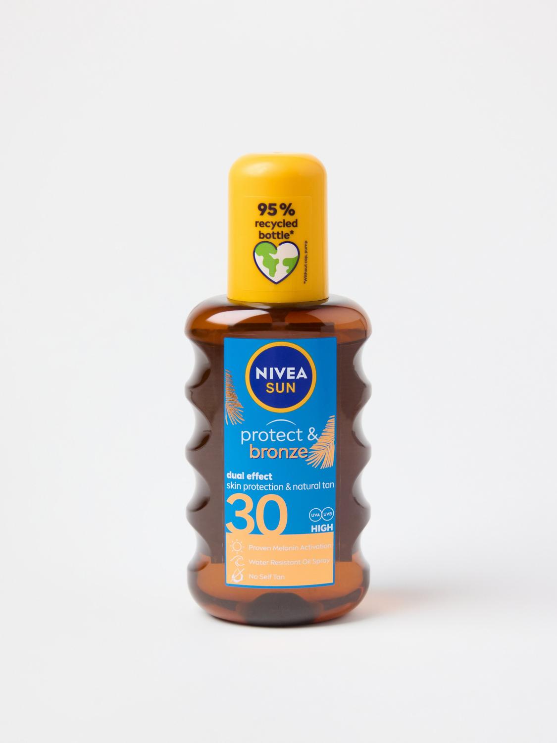 NIVEA SUN Protect & Moisture Sun Spray SPF 30 skyddar och vårdar huden från insidan och utsidan. Solkräm med högt solskydd. Ger omedelbart skydd mot UVA- och UVB-strålar, solbrändhet och för tidigt åldrande av huden. Den vattenresistenta och icke-feta formulan med vitamin E återfuktar huden i 48 timmar. Denna solskyddsspray fungerar i harmoni med hudens mikrobiom, ett naturligt lager av bakterier som fungerar som hudens försvarssystem. Dessutom bidrar denna NIVEA solkräm till långvarig och intensiv återfuktning. Den vårdande formulan är 78% biologiskt nedbrytbar. Flaskan är tillverkad av 95 % återvunnet material exklusive lock och pump. Detta solskydd är dermatologiskt testad. Skaka väl. Spraya inte direkt i ansiktet, undvik inandning. Applicera generöst och ofta. Särskilt efter bad/svettning/handdukstorkning. Mängd för vuxen är 30ml. För lite produkt reducerar skyddsnivån. Vistas inte för länge i solen, även om du använder solskydd. Överexponering av solen utgör en hälsorisk.