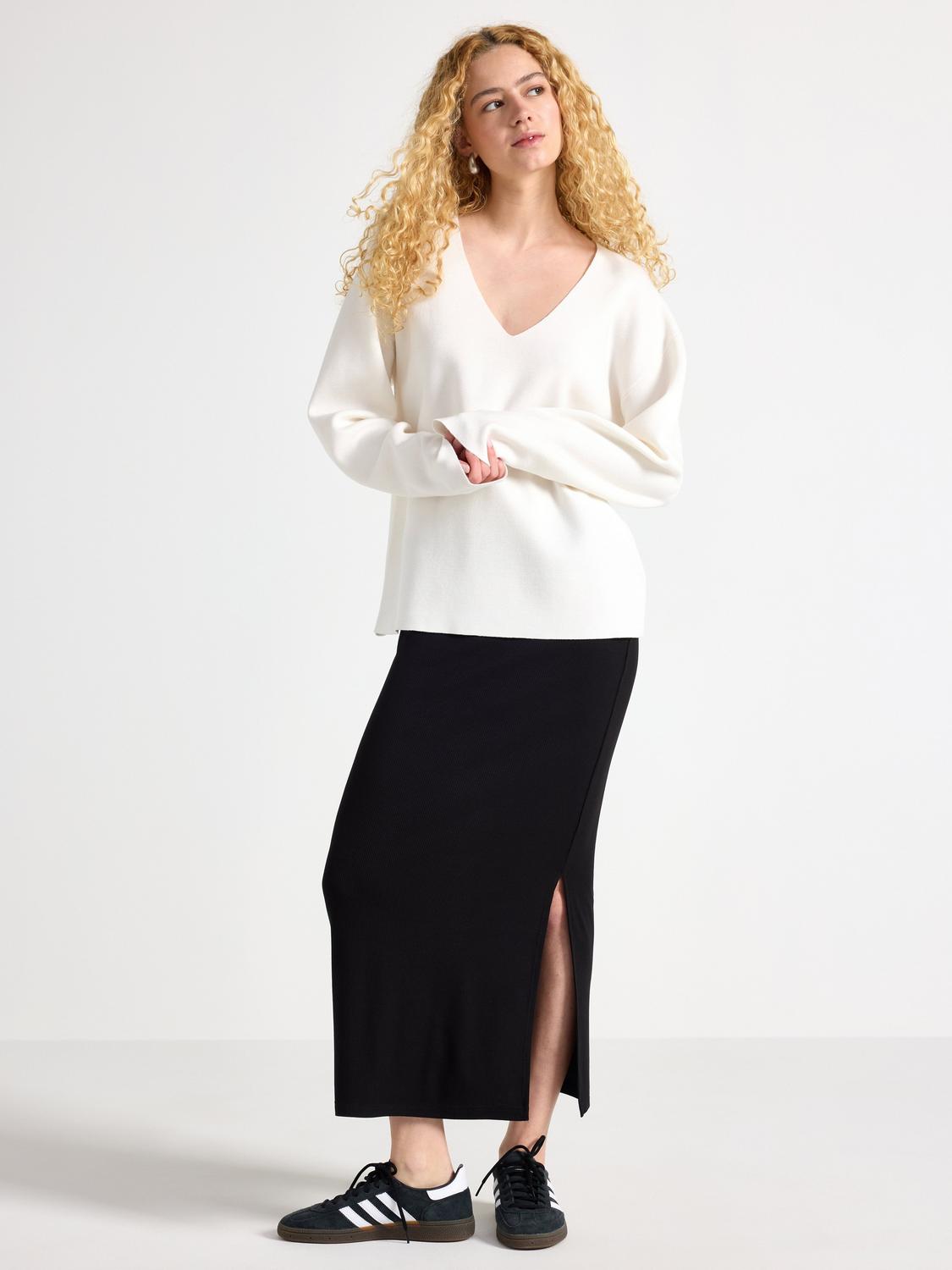 En vävd kjol i bomullsblandning med ett randigt mönster. Kjolen har en bred resår i midjan med dragsko för justering.