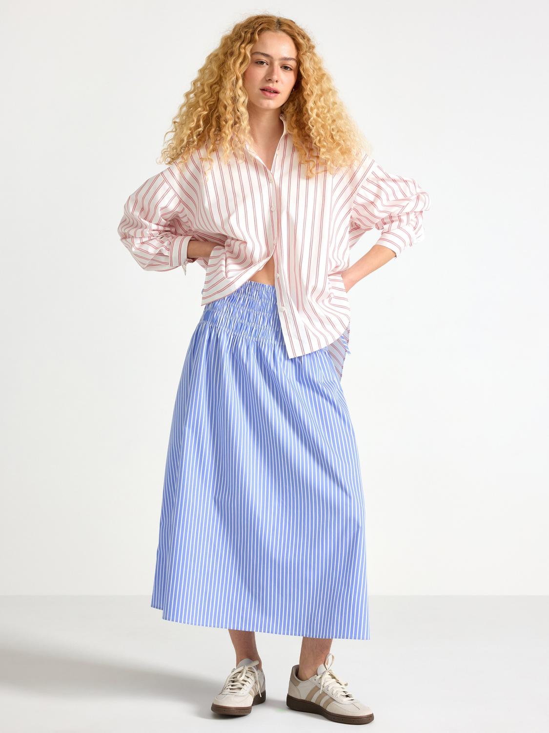 Denna midikjol har ett klassiskt randigt mönster och en bekväm smockad midja. Kjolen är lätt att matcha med olika toppar och skor för en mängd olika stilar.