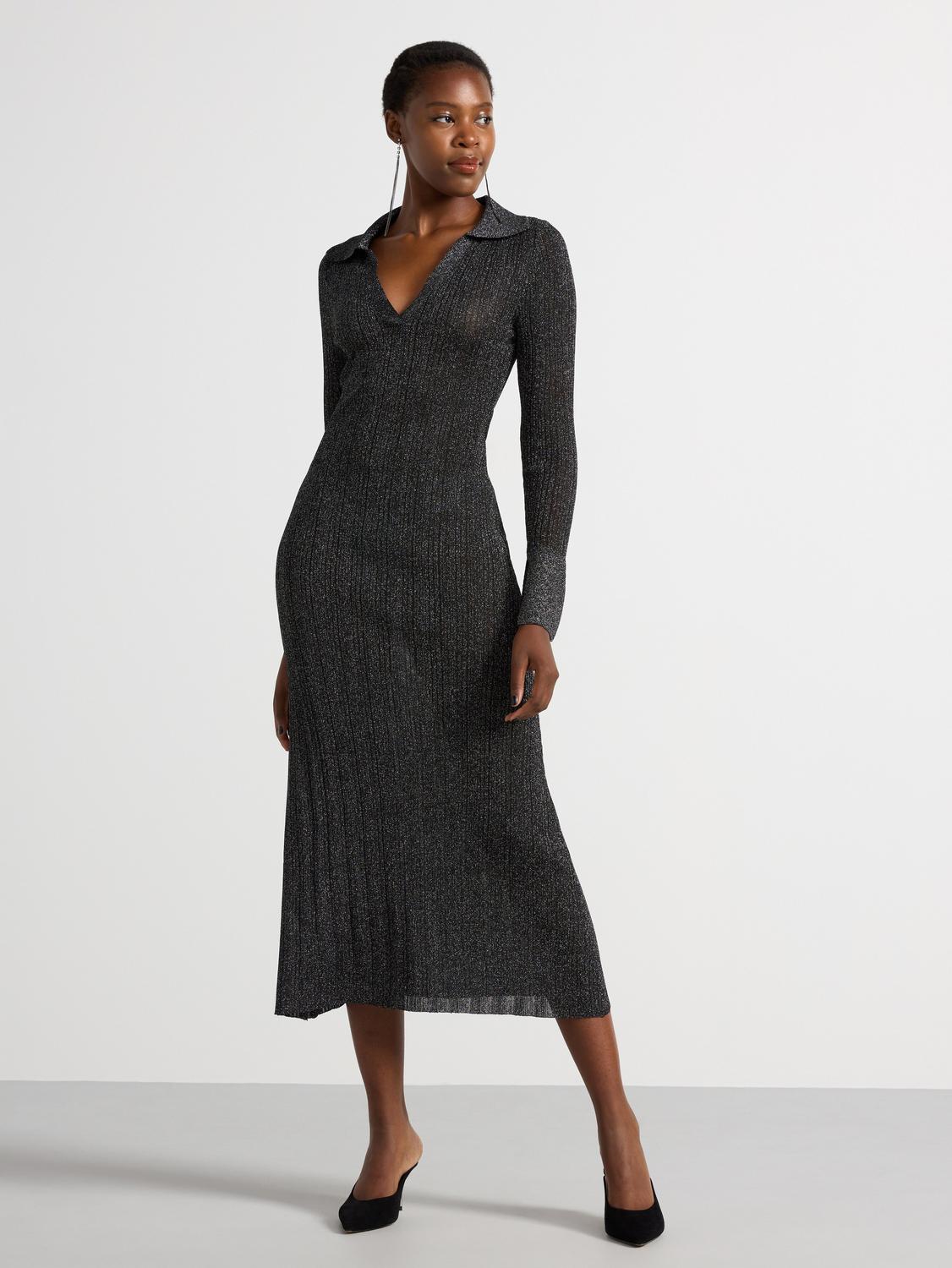 Denna ribbade midiklänning har en smickrande, figurnära passform och långa ärmar, vilket gör den perfekt för både vardag och fest. Knapparna framtill ger en extra touch av elegans.