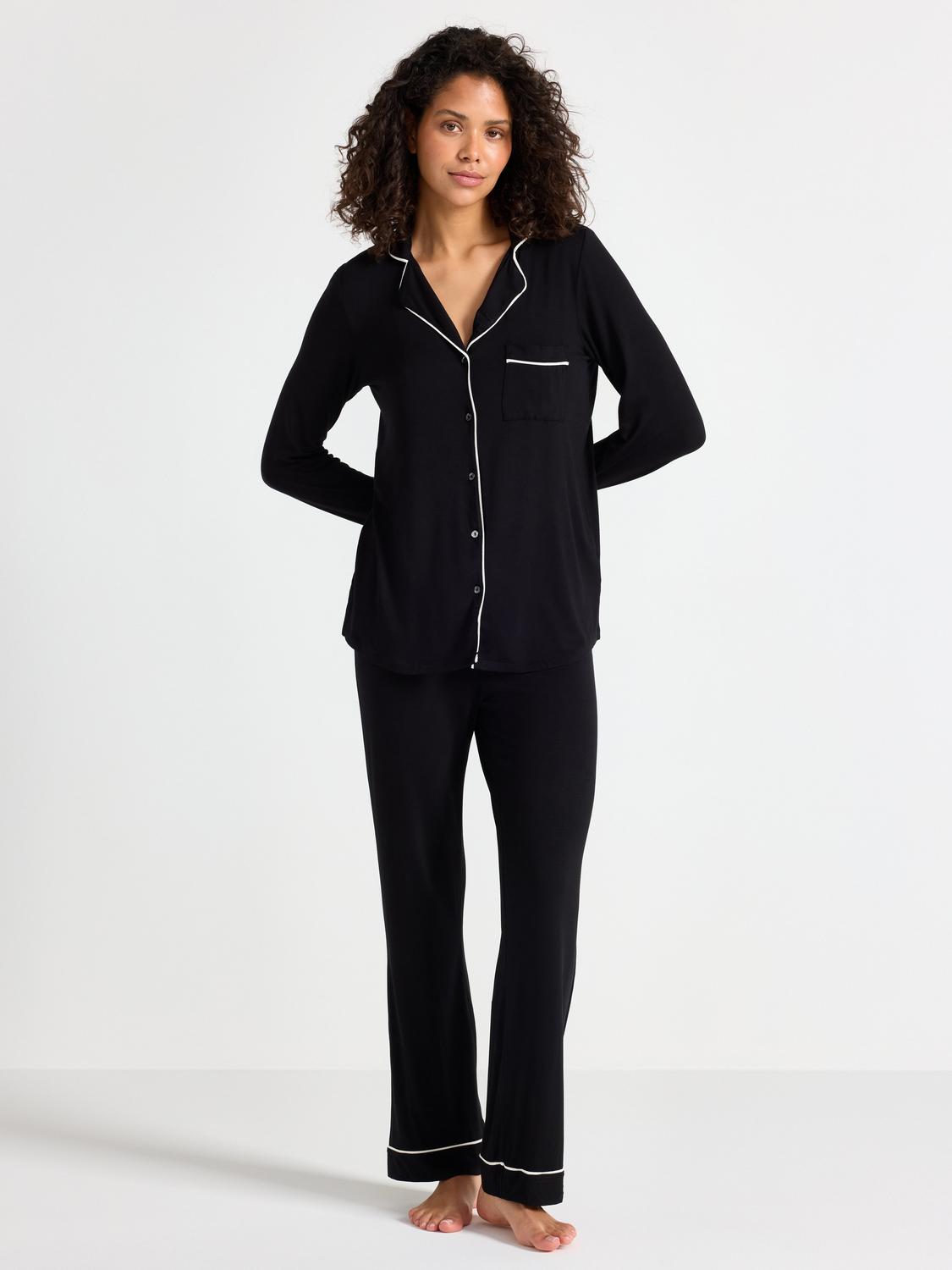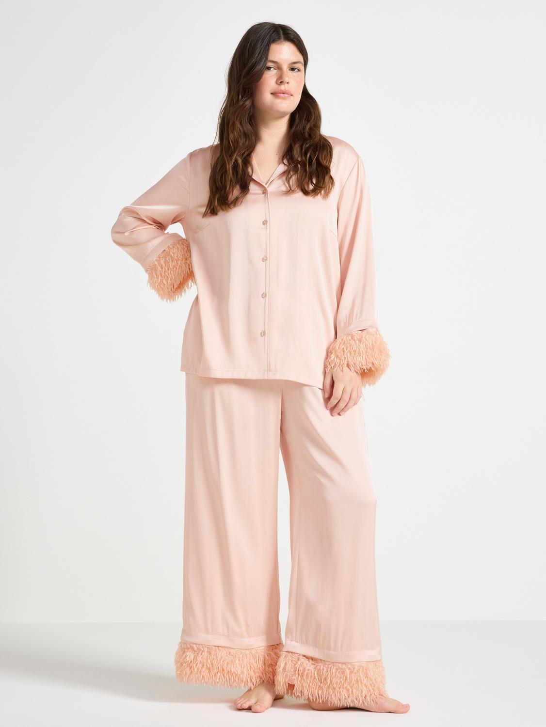 Detta pyjamaslinne är tillverkat i mjukt satinmaterial och har fina volangdetaljer. Linnet har en elastisk kant upptill och knyts framtill, vilket ger en bekväm och feminin passform.