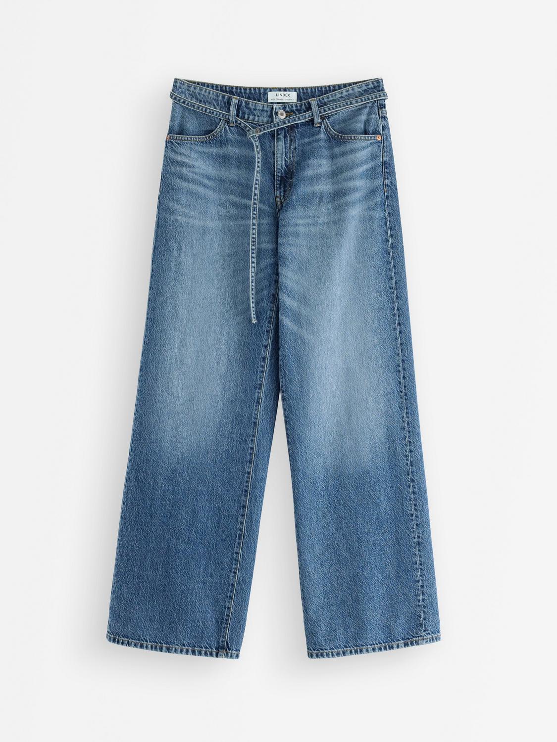 Jeans med medelhög midja i denim med vida extra vida ben och avtagbart knytskärp i midjan.