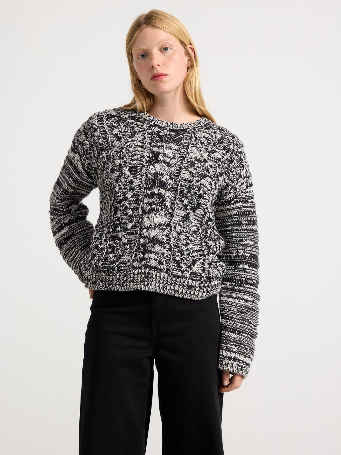 En söt stickad tröja med ett fint pointellmönster och en dekorativ rosett baktill. Tröjan är perfekt för barn och passar bra både till vardag och fest.