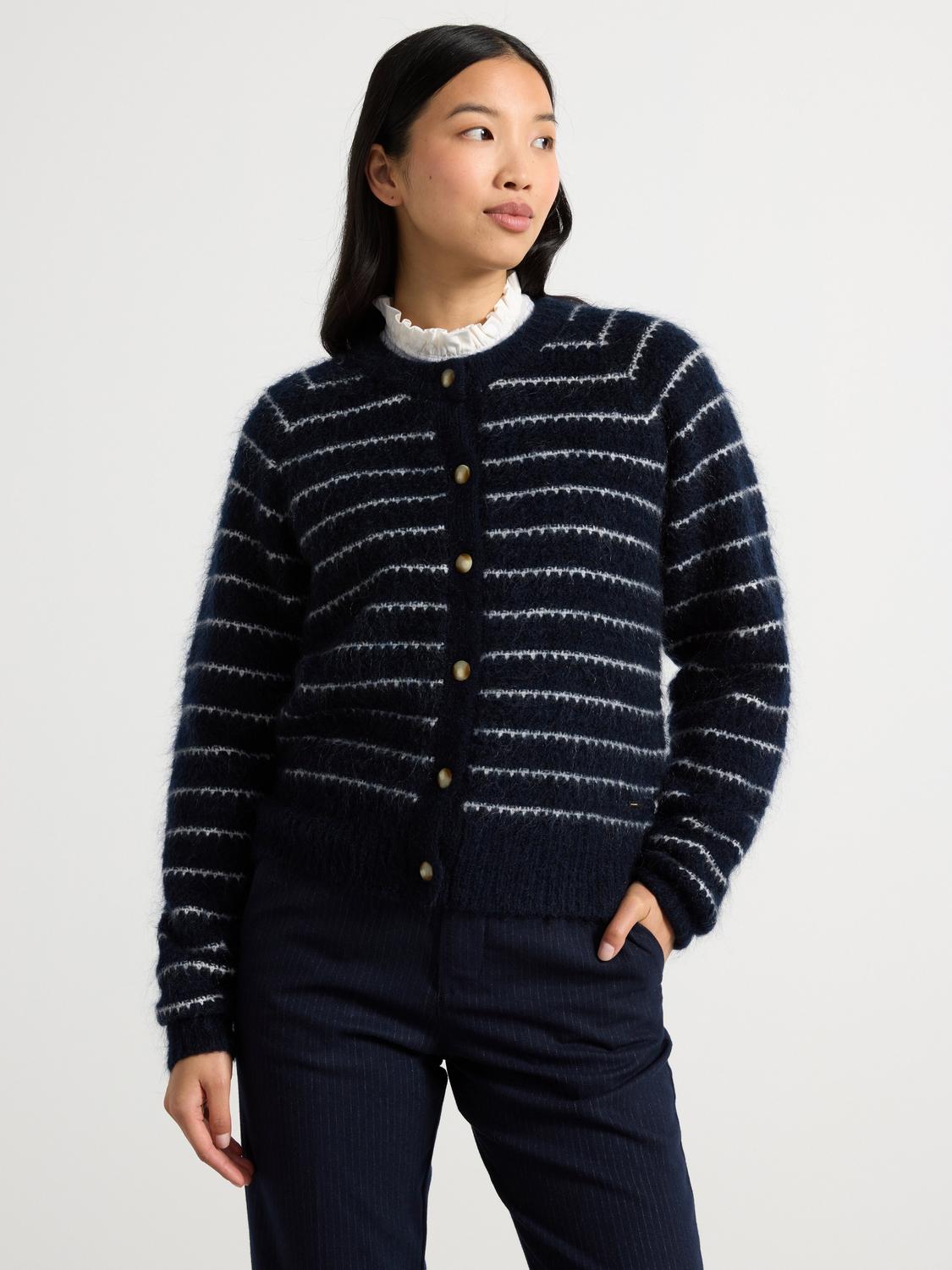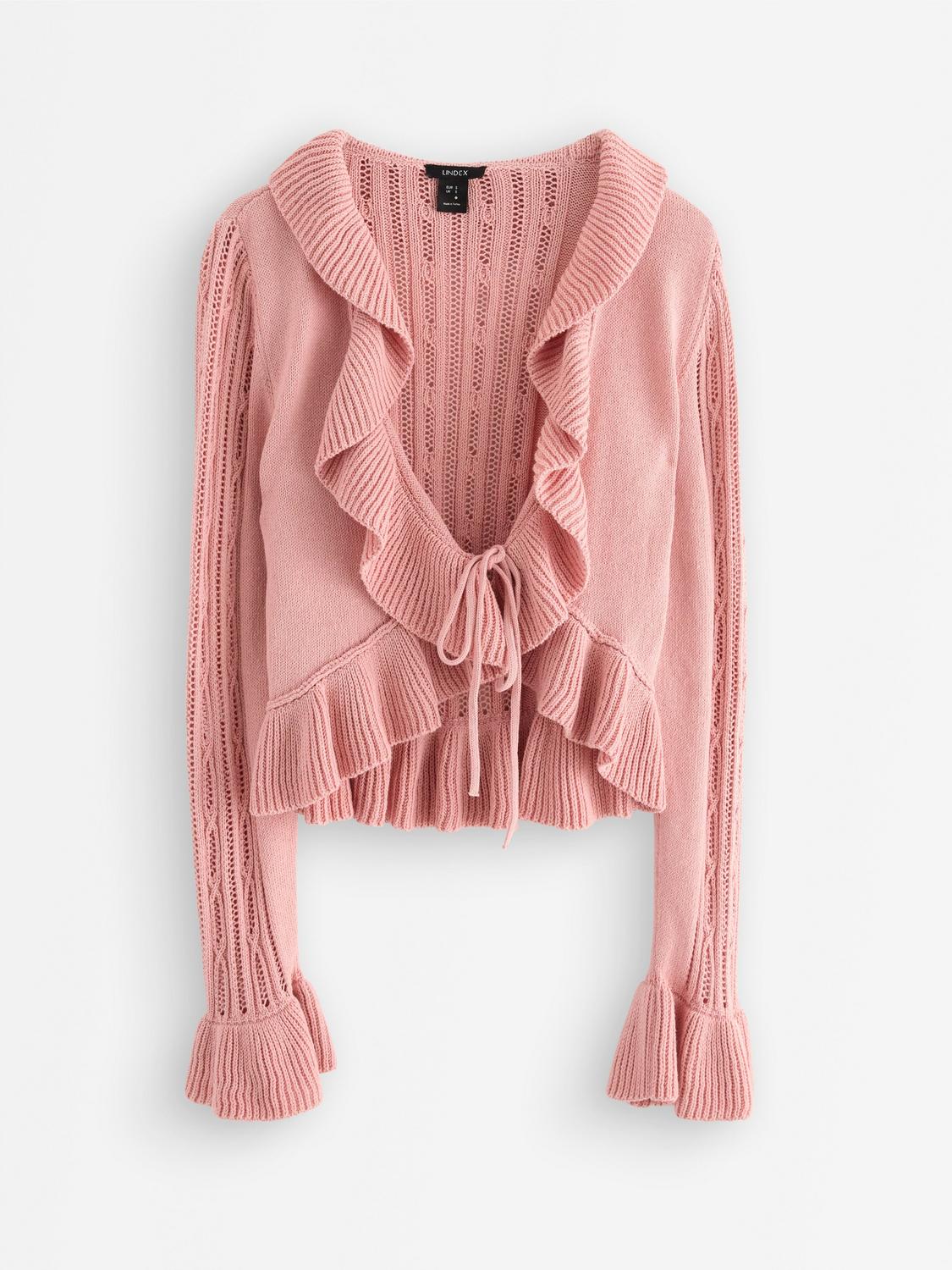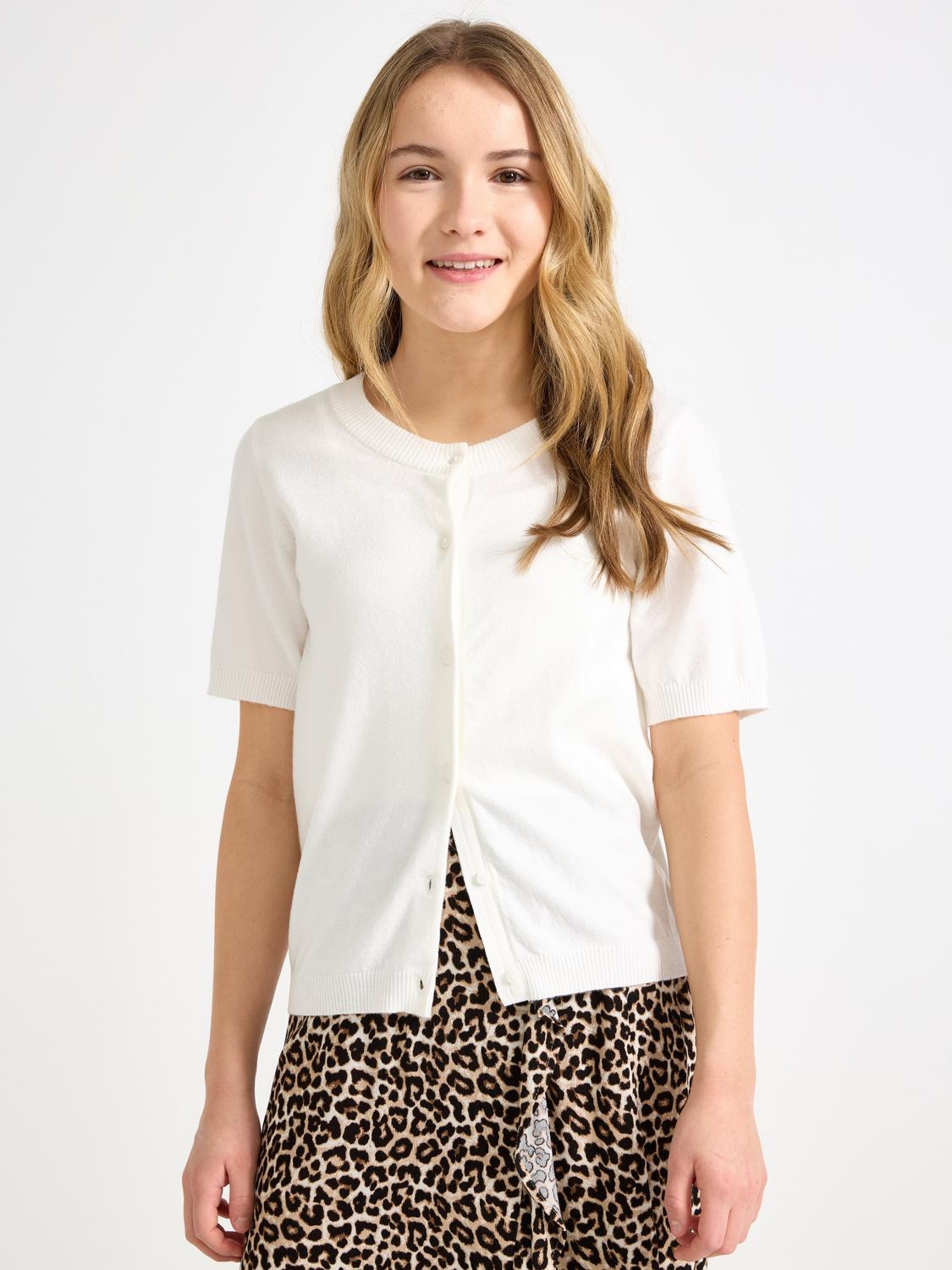 En mönsterstickad cardigan i mjuk bomullstrikå, perfekt för barn. Koftan har en knappstängning och vågiga kanter som ger den en fin detalj. Den är bekväm att bära och passar bra både till vardag och fest.