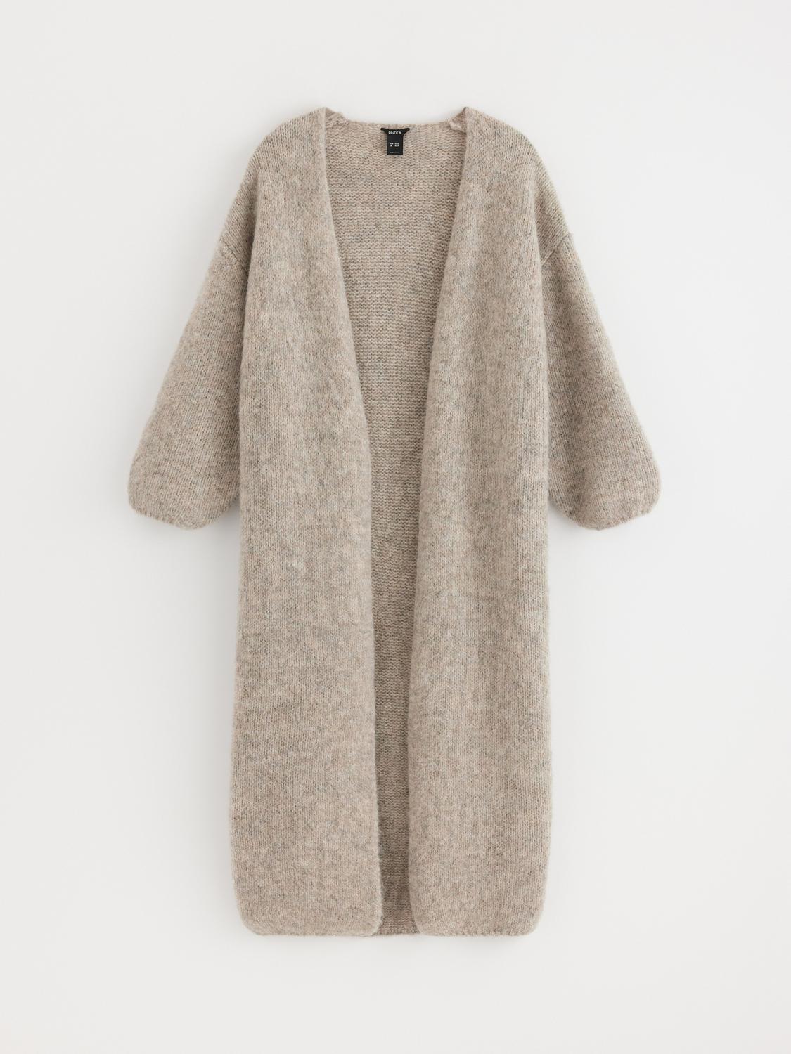 Denna stickade cardigan har en feminin touch med sina volangdetaljer och knytband. Den är perfekt att svepa om sig under kyliga dagar eller som ett stilfullt komplement till din outfit.