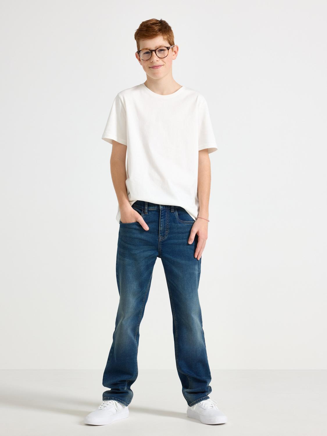 Dessa superstretchiga jeans är gjorda i ett mjukt bomullsmaterial och har en bekväm passform med raka ben. De har en normalhög midja och är perfekta för barn som vill ha ett par sköna och flexibla jeans.