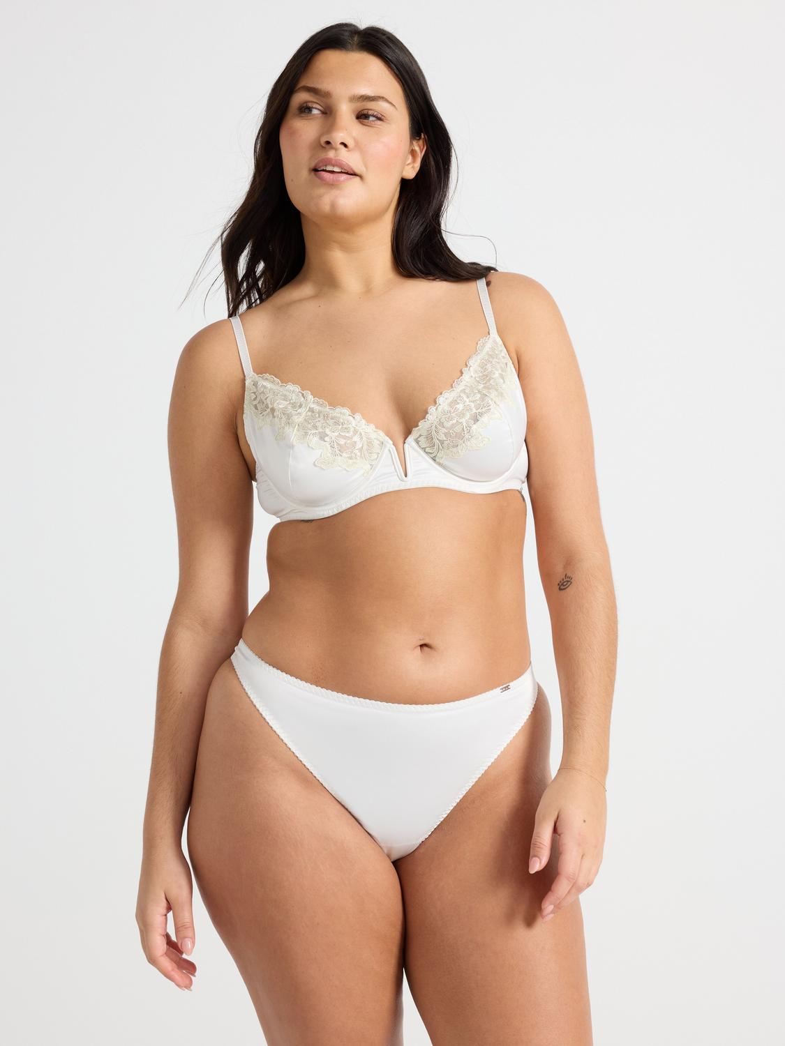 Mjuka, stilrena braziliantrosor i satin med blomsterspets.