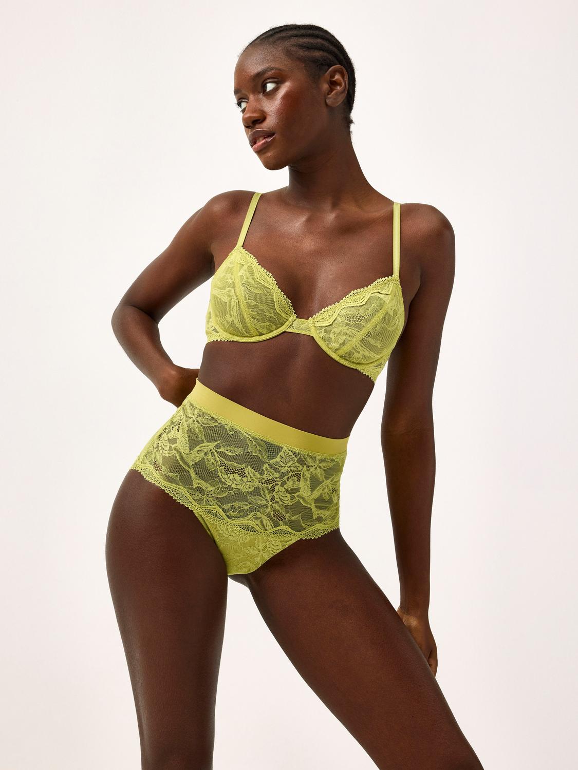 Bralette i spets med breda axelband. Använd den med korsad rygg eller bara som den är. Garnet är stretchigt och mjukt mot huden. Resårband med ribbad baksida och mjuka kanter för att förhindra att de gräver sig in. Mjukare. En känsla av frihet.