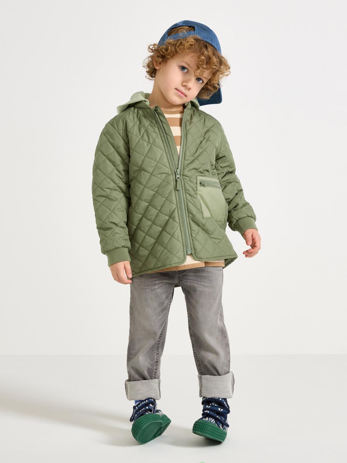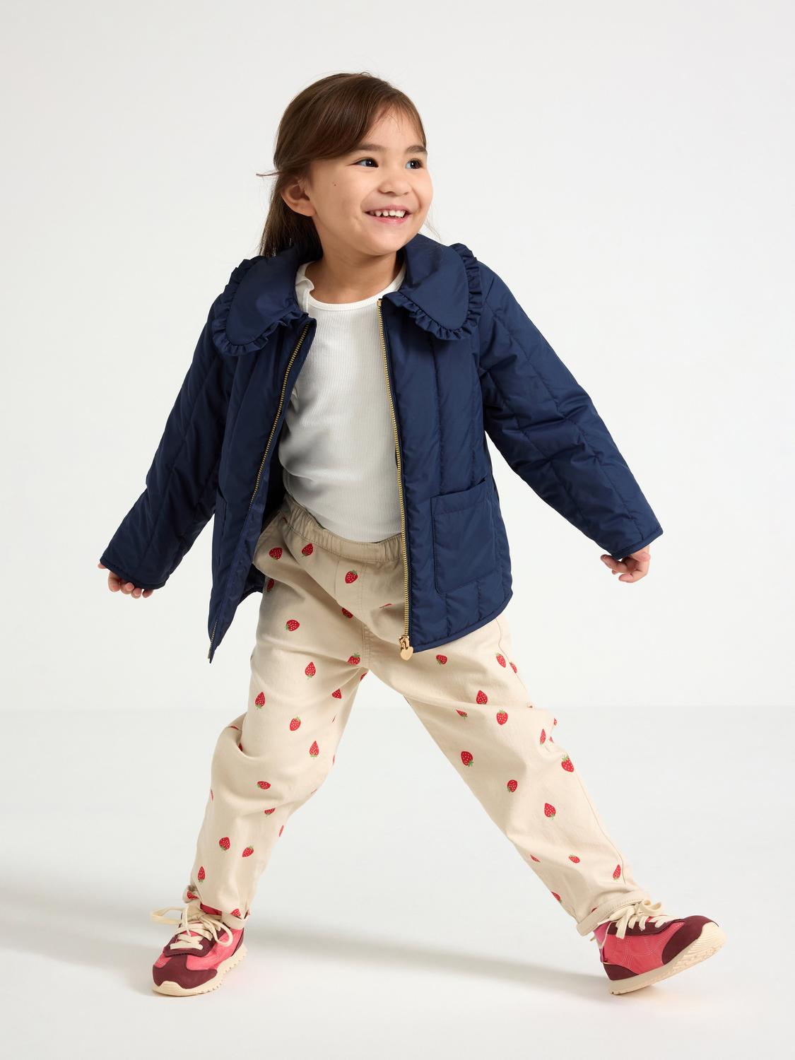 Denna jacka är tillverkad i mjuk bomullstrikå och har en design som liknar denim. Jackan har en klassisk stil och är bekväm att bära. Den passar perfekt för lek och bus både inne och ute.