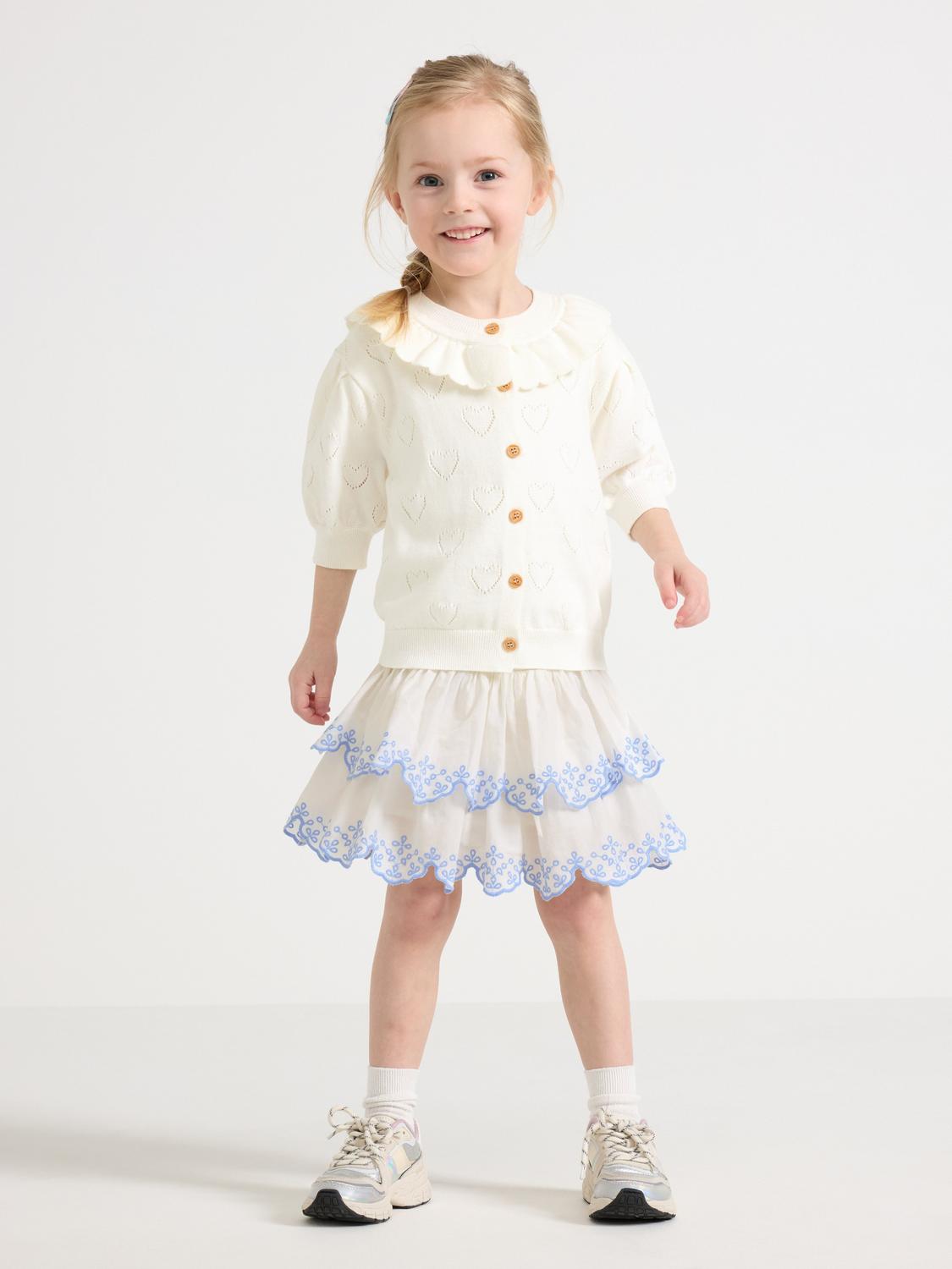 Denna kjol har en utsvängd modell med fina broderier och volanger. Den har en smockmidja som gör den bekväm att bära. Perfekt för lek och bus eller för finare tillfällen.