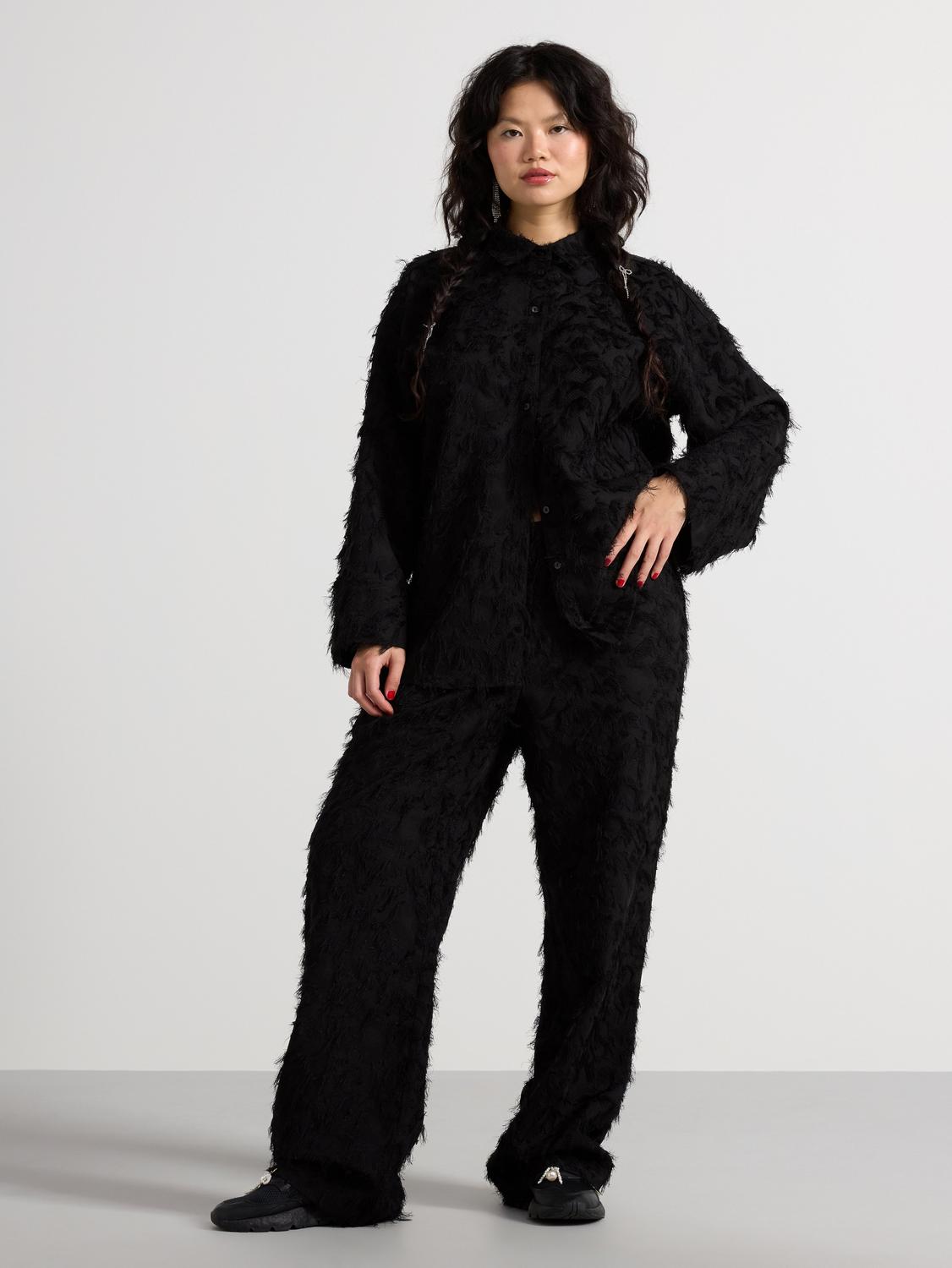 Dessa byxor har en rak passform och vida ben, vilket ger en avslappnad och modern silhuett. Det speciella med dessa byxor är den luddiga texturen som täcker hela ytan, vilket ger en unik och iögonfallande look.