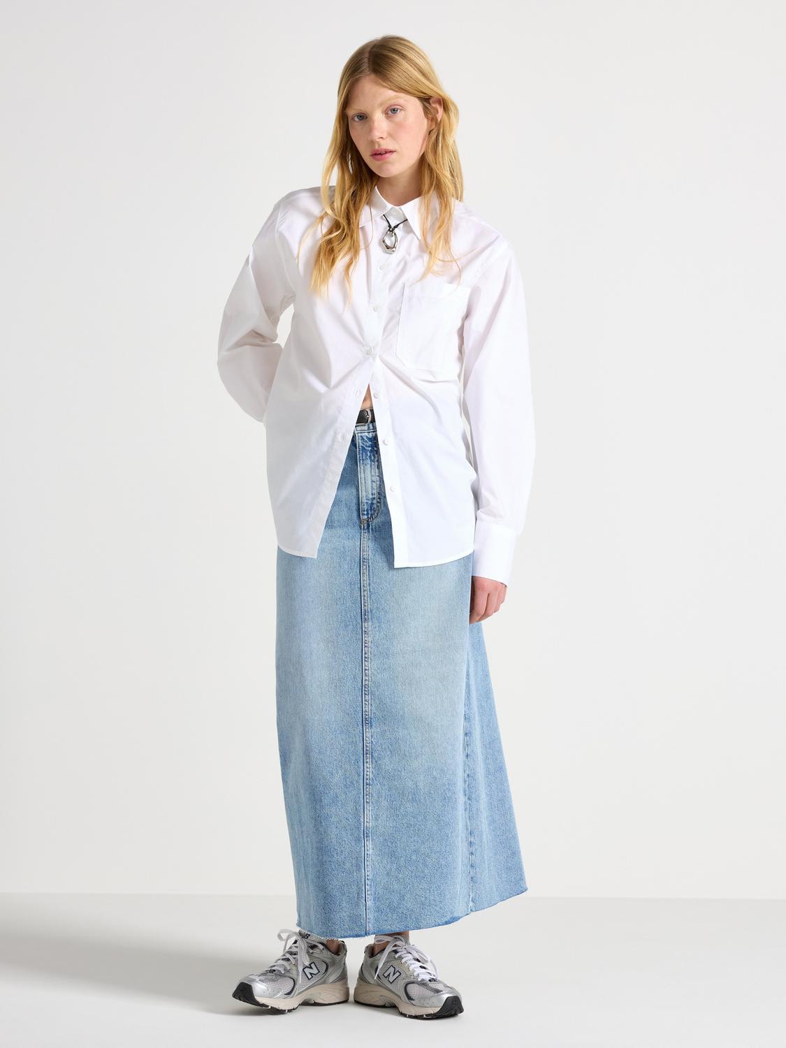 Denna midikjol är tillverkad i en mjuk bomulls-terry blandning med återvunnen polyester. Kjolen har en smal passform, en hög slits baktill och ett elastiskt midjeband med knytband för extra komfort. En bekväm och stilren kjol för vardagsbruk.