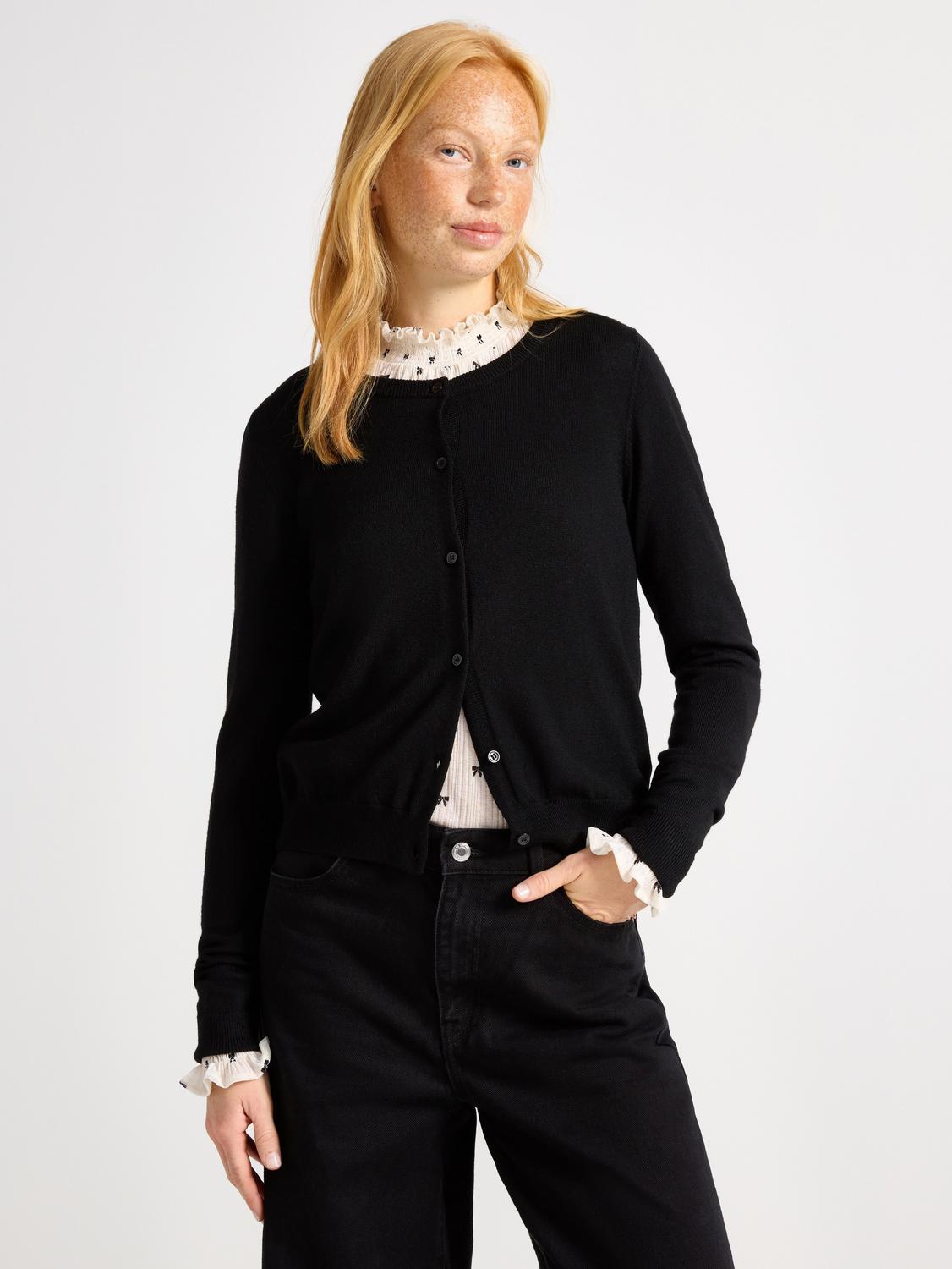 Denna figursydda cardigan är tillverkad i ett mjukt, ribbstickat material och har en smickrande passform. Den har en klassisk rund halsringning och stängs med söta blommiga knappar framtill. Perfekt för att skapa en feminin och stilren look.