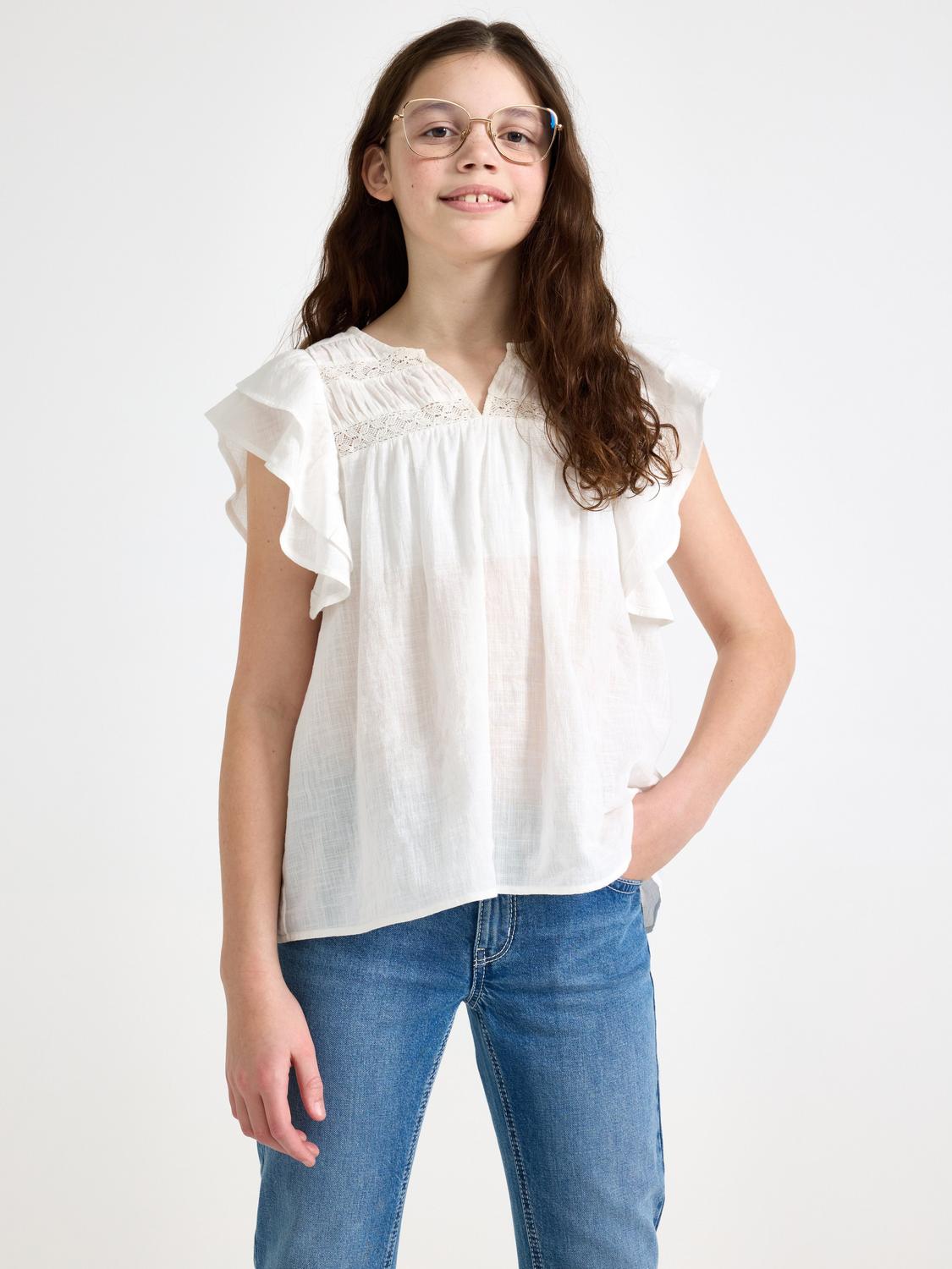 Denna blus har en avslappnad och rymlig passform, med en djup V-ringning och nedhasade axlar. De utsvängda ärmarna och volangdetaljerna ger en feminin touch. Blusen är tillverkad av ett mjukt och vävt tyg, vilket gör den bekväm att bära.