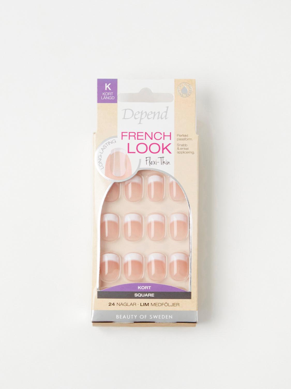 Lösnaglar för en perfekt fransk manikyr på bara några minuter. Flexi-Thin ger den ultimata passformen, är enkla att applicera och har en högglansig yta som varken flagnar eller tappar färg. Lim medföljer. OBS! Vi rekommenderar max 10 dagars användning av lösnaglar i sträck. Sedan skall naglarna luftas innan en ny applicering kan göras, förutsatt att dina naglar då är i god kondition. Vid borttagning av lösnaglar använd Depend Lösnagelremover. OBS! Bryt eller drag aldrig av lösnageln eftersom det kan skada din naturliga nagel.Försiktighetsåtgärder för lim: Om hudens ytor klistras fast, dra ej utan använd en acetonbaserad remover. Använd aldrig lösnaglar om dina naturliga naglar är tunna, skadade eller infekterade. Undvik hetta. Nagellim kan fläcka eller skada tyg. Skydda ytor mot eventuellt spill innan limmet öppnas. Avlägsna kapsylen, håll limtuben upprätt och vrid av vingen för att öppna limmet. OBS: Tuben är en engångsförpackning och kan inte återförslutas. Lägg därför inte den öppna tuben ned, då limrester kan läcka ut. Cyanoakrylat. Fara. Fäster snabbt på hud och ögon. Förvaras oåtkomligt för barn. Orsakar allvarlig ögonirritation. Irriterar huden. Kan orsaka irritation i luftvägarna. VID KONTAKT MED ÖGONEN: Skölj försiktigt med vatten i flera minuter. Ta ur eventuella kontaktlinser om det går lätt. Fortsätt att skölja. Vid bestående ögonirritation: Sök läkarhjälp.
