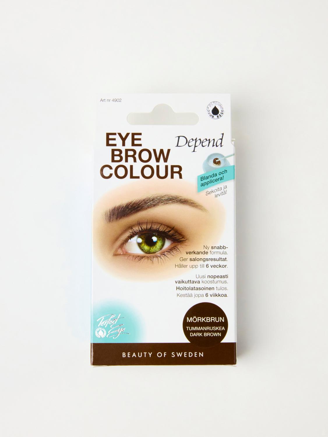Depend Eyebrow Colour ger en intensiv färgåtergivning på ögonbrynen som framhäver formen på ett mer markerat sätt. Formula med Risprotein och olja utvunnen från Ängskrasse som kortar ner behandlingstiden och ger salongsresultat. Färgningsprocessen i håret sker på ett skonsammare sätt, resultatet är permanent och vattenfast. Håller upp till 6 veckor, innehållet i förpackningen räcker till 8-10 behandlingar. Välj mellan färgerna svart, brunsvart, mörkbrun och brun. Varning: Innehåller väteperoxid. Undvik kontakt med ögonen. Skölj genast ögonen om produkten kommer i kontakt med dem. Använd inte produkten om du har någon irritation/inflammation i eller på huden runt ögat. Använd inte produkten på ögonbrynen om du har plockat eller vaxat dem de senaste 72 timmarna.Om du någon gång under behandlingen känner en svidande eller stickande känsla ska du genast avbryta behandlingen. Detta kan vara ett tecken på en överkänslighet mot någon av de ingående ingredienserna.Innehåller fenylendiaminer (toluen-diaminer). Använd ej till färgning av ögonfransar. Behandlingen bör inte utföras i tätare intervaller än var 4:e vecka.Hårfärgningsmedel kan orsaka allvarliga allergiska reaktioner. Läs och följ bruksanvisningen. Produkten är inte avsedd för användning på personer under 16 år. Temporära tatueringar med svart henna kan öka risken för allergier. Färga inte håret om — du har utslag i ansiktet eller känslig, irriterad och skadad hårbotten, — du har reagerat på hårfärgningsmedel tidigare, — du har reagerat på en temporär tatuering med svart henna tidigare. Gör ett allergitest minst 48 timmar före användning.Allergitest: Allergiska reaktioner mot färgämnen kan inträffa när som helst. Utför därför allergitest minst 48 timmar före behandlingen. Applicera en klick färdigblandad crème enligt blandningsinstruktion i armvecket (skydda dina kläder).Låt verka i 10 min. Skölj sedan av med ljummet vatten. Om huden reagerar med sveda och irritation inom 48 timmar ska du ej använda denna produkt. Även om testet inte visar något utslag är detta inte en garanti utan endast en extraförsiktighetsåtgärd mot en eventuell allergisk reaktion.