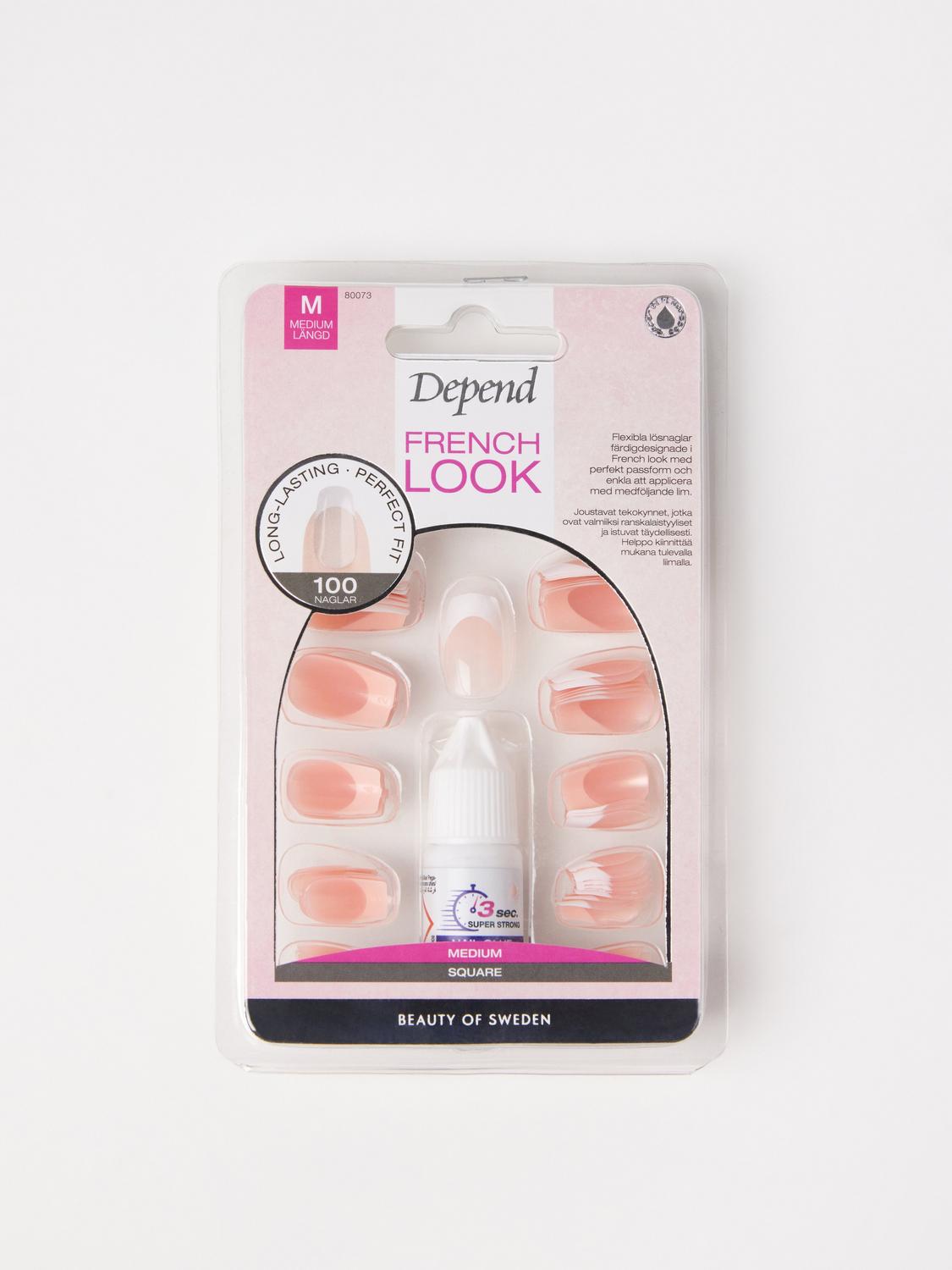 Lösnaglar för en perfekt fransk manikyr på bara några minuter. Flexi-Thin ger den ultimata passformen, är enkla att applicera och har en högglansig yta som varken flagnar eller tappar färg. Lim medföljer. OBS! Vi rekommenderar max 10 dagars användning av lösnaglar i sträck. Sedan skall naglarna luftas innan en ny applicering kan göras, förutsatt att dina naglar då är i god kondition. Vid borttagning av lösnaglar använd Depend Lösnagelremover. OBS! Bryt eller drag aldrig av lösnageln eftersom det kan skada din naturliga nagel.Försiktighetsåtgärder för lim: Om hudens ytor klistras fast, dra ej utan använd en acetonbaserad remover. Använd aldrig lösnaglar om dina naturliga naglar är tunna, skadade eller infekterade. Undvik hetta. Nagellim kan fläcka eller skada tyg. Skydda ytor mot eventuellt spill innan limmet öppnas. Avlägsna kapsylen, håll limtuben upprätt och vrid av vingen för att öppna limmet. OBS: Tuben är en engångsförpackning och kan inte återförslutas. Lägg därför inte den öppna tuben ned, då limrester kan läcka ut. Cyanoakrylat. Fara. Fäster snabbt på hud och ögon. Förvaras oåtkomligt för barn. Orsakar allvarlig ögonirritation. Irriterar huden. Kan orsaka irritation i luftvägarna. VID KONTAKT MED ÖGONEN: Skölj försiktigt med vatten i flera minuter. Ta ur eventuella kontaktlinser om det går lätt. Fortsätt att skölja. Vid bestående ögonirritation: Sök läkarhjälp.