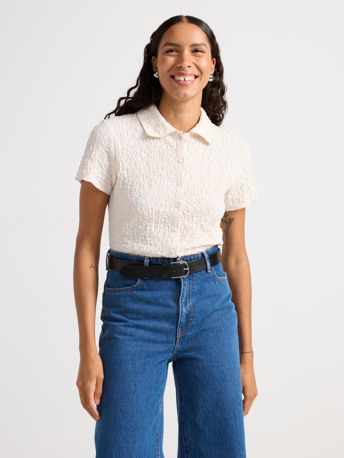 Mjuk och snygg skjorta med krage, knappstängning fram och korta ärmar.