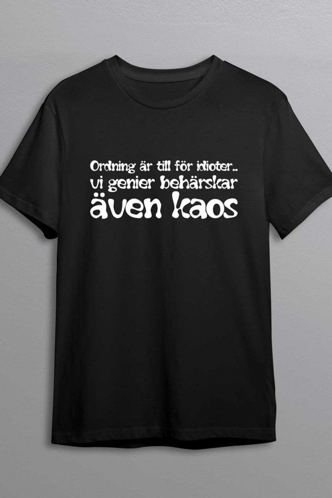 Ordning är till för idioter T-shirt.Denna svarta T-shirt är det perfekta plagget för den självsäkra och kreativa personligheten som föredrar en 'organiserad röra'. Med det sturska uttalandet "Ordning är till för idioter - vi genier behärskar även kaos", förkunnar den en lekfull utmaning till konventionella synsätt på ordning och struktur.T-shirten är en utmärkt present till den där vän som alltid tycks ha tusen projekt på gång och aldrig ett rent skrivbord. Den är också perfekt för den artistiska själen som vet att de bästa idéerna ofta föds ur det som vid första anblicken kan se ut som oordning.Klä på dig denna T-shirt när du behöver en självironisk boost eller när du vill visa omvärlden att du är ett kreativt geni som inte behöver städa upp för att hitta din inre kompass. Låt det vara din rustning i en värld som ibland kan vara alltför besatt av att allt ska ligga på rätt plats.