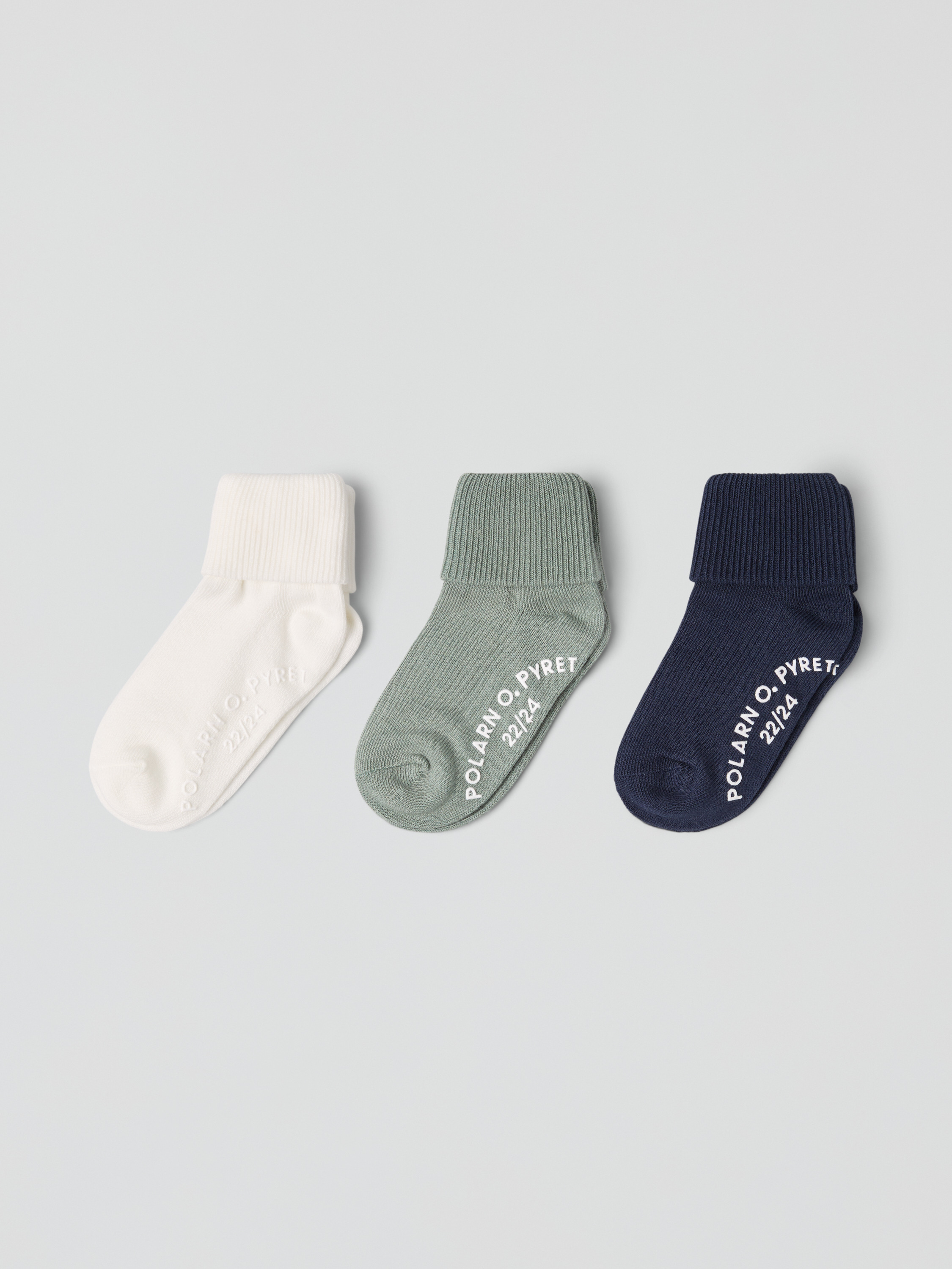 Ett praktiskt 3-pack med enfärgade strumpor i ekologisk bomull. Strumporna har en mjuk och vikbar mudd som håller dem på plats utan att skava. Färgerna är enkla att matcha med andra kläder.