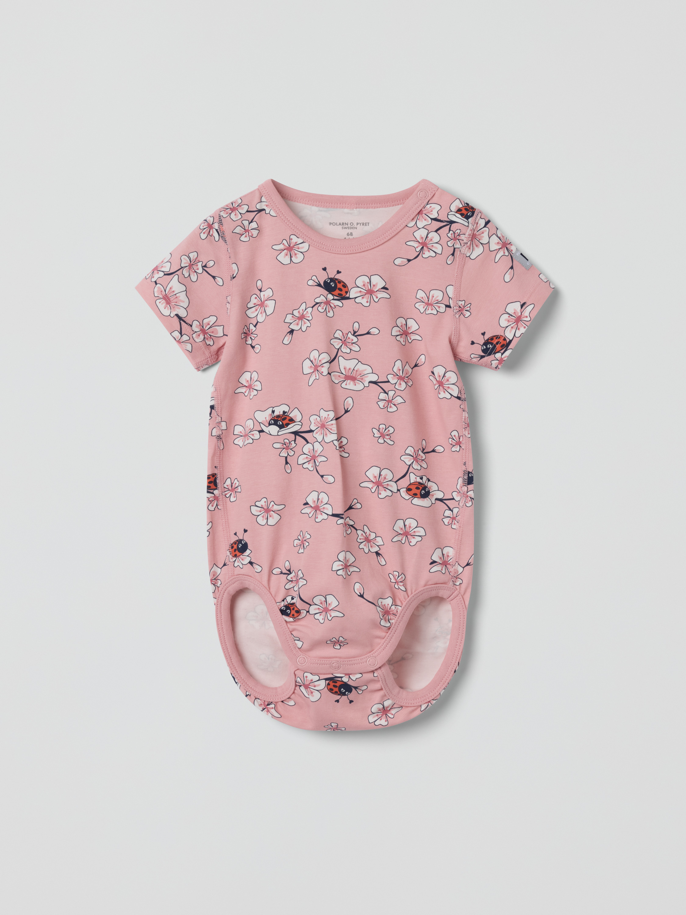 En söt kortärmad body för baby, tillverkad i mjuk ekologisk bomull. Bodyn har ett fint blommönster och praktiska tryckknappar som underlättar vid klädbyten.
