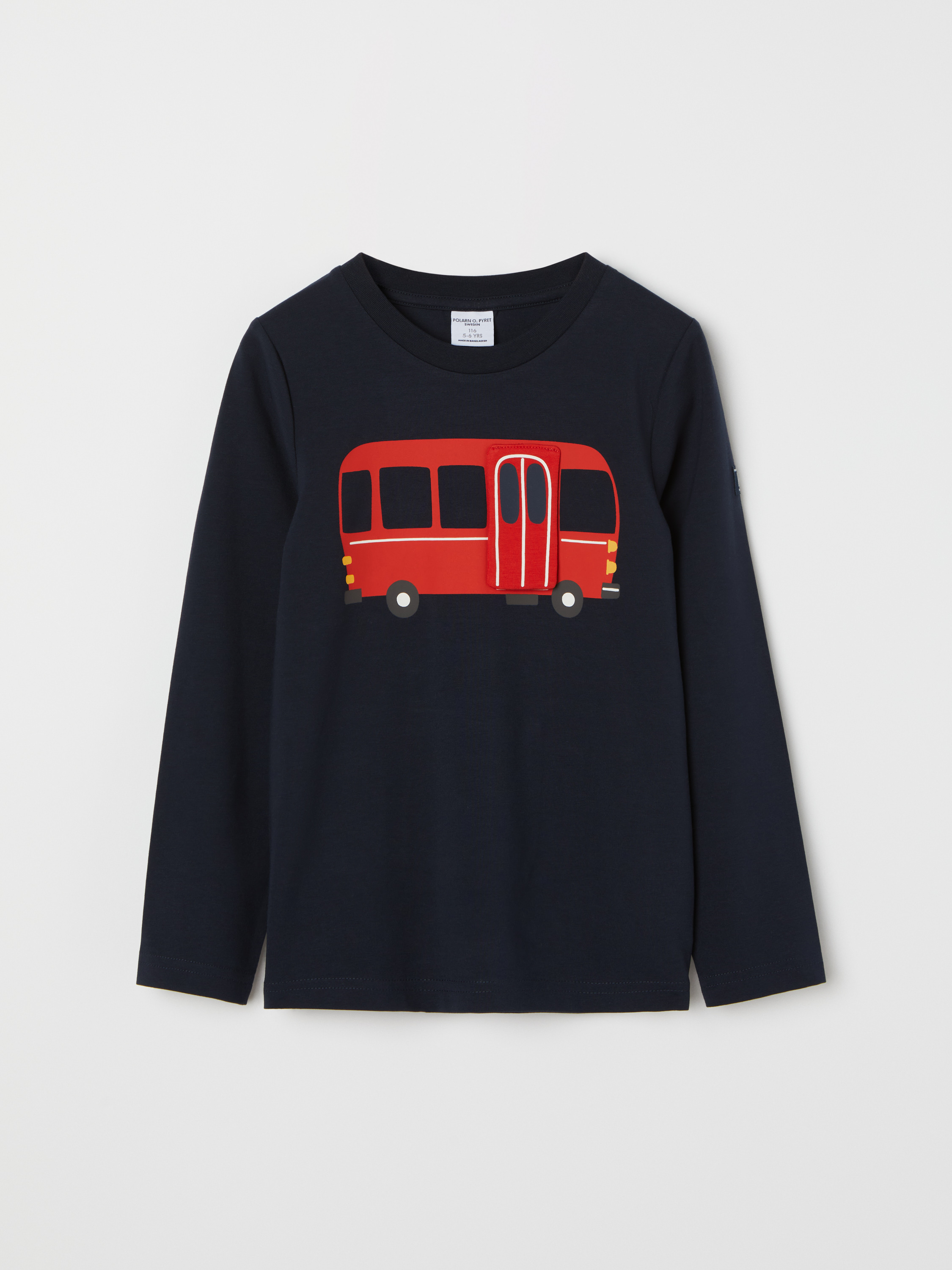 Denna mjuka och bekväma långärmade t-shirt är tillverkad i ekologisk bomullstrikå. Tröjan har ett färgglatt tryck med en buss på framsidan, vilket gör den extra rolig att bära. Storlekar upp till 92 har praktiska tryckknappar vid axeln för enklare på- och avklädning.