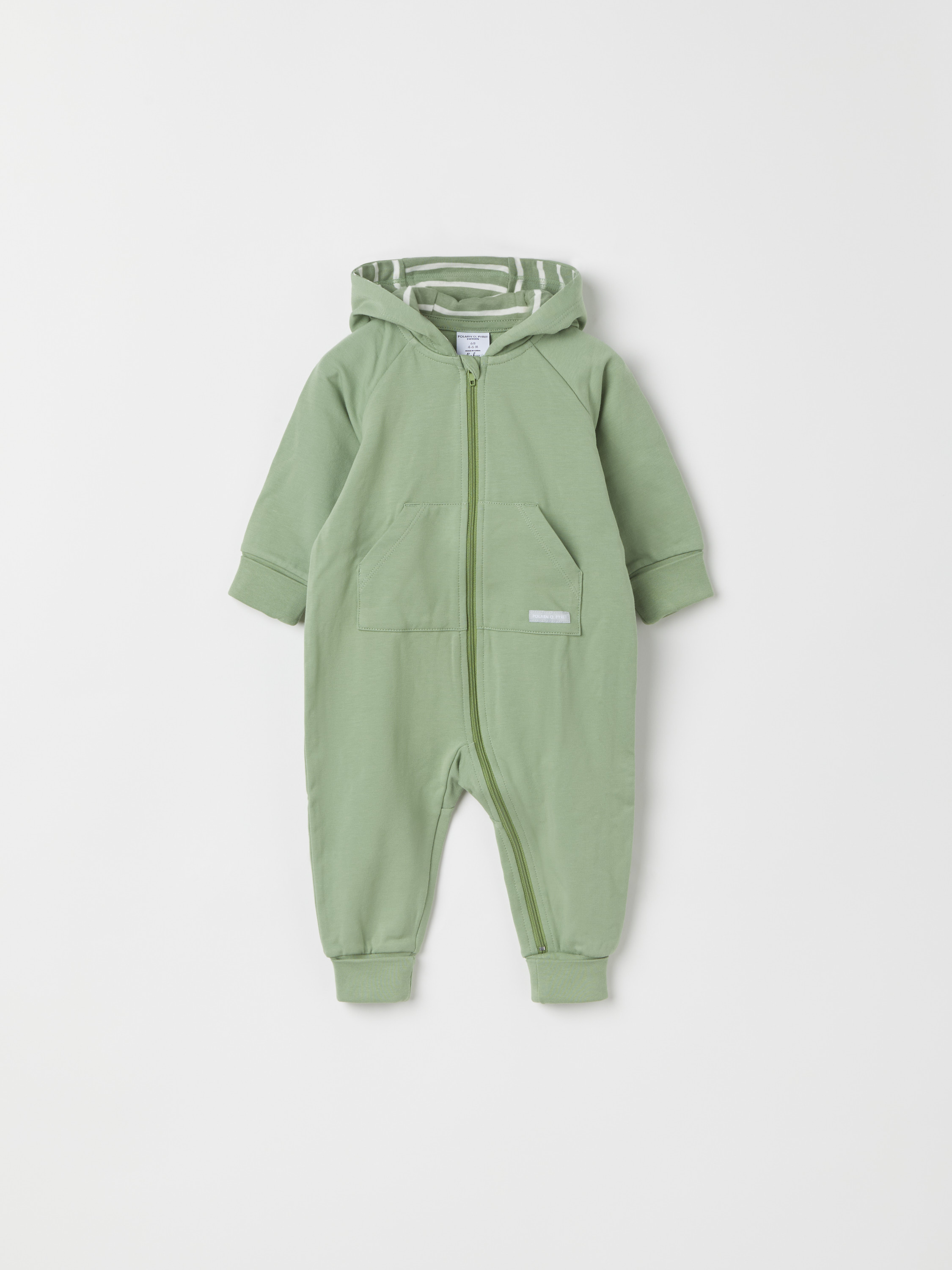 En bekväm overall för baby, tillverkad i ekologisk bomull med en mjuk, borstad insida. Overallen har en praktisk känguruficka och en fodrad huva med klassiska ränder. Den långa dragkedjan underlättar vid klädbyten och har ett skydd för att undvika skav.