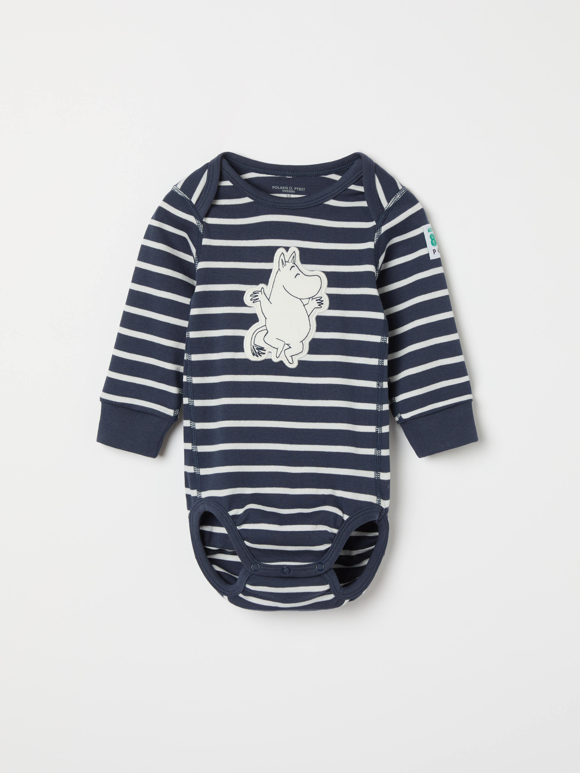 En klassisk randig body i mjuk ekologisk bomullstrikå, perfekt för din baby. Bodyn pryds av en söt Mumin-applikation och har praktiska omlottlagda axlar för enkel påklädning. Tryckknapparna i grenen underlättar blöjbyten.